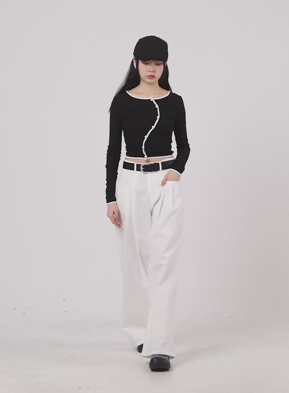 asymmetrical-neck-solid-button-long-sleeve-top-ca402 / Black
