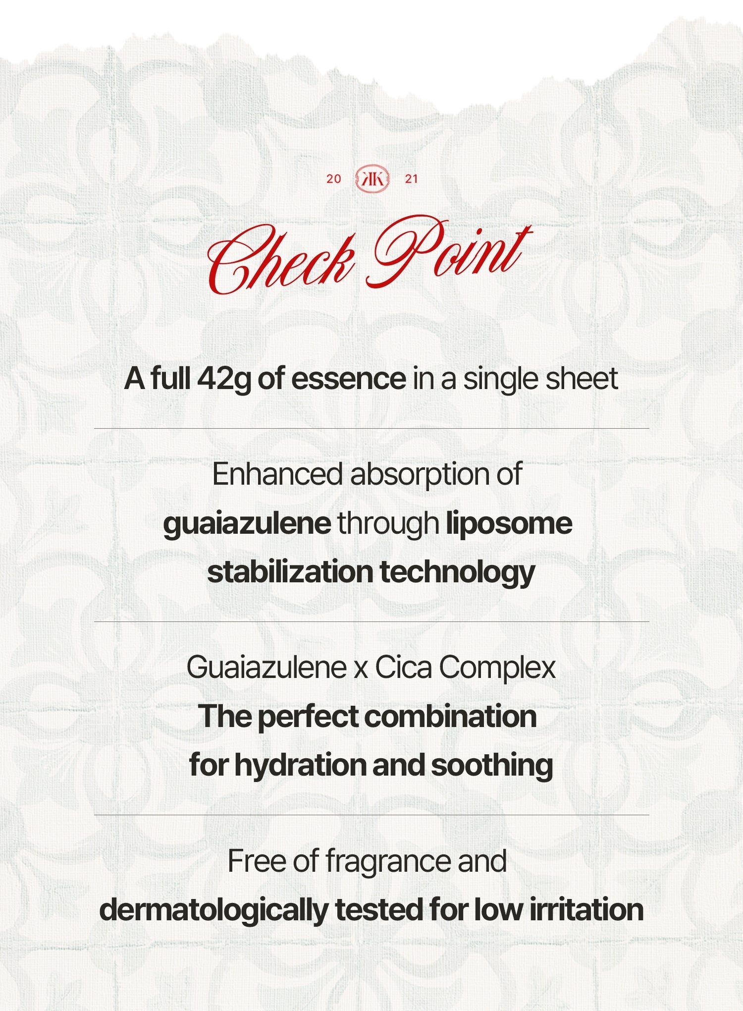 Open the pouch, take out the mask, remove the protective films on both sides, apply evenly to the face, leave on for about 20–40 minutes, then remove the mask.