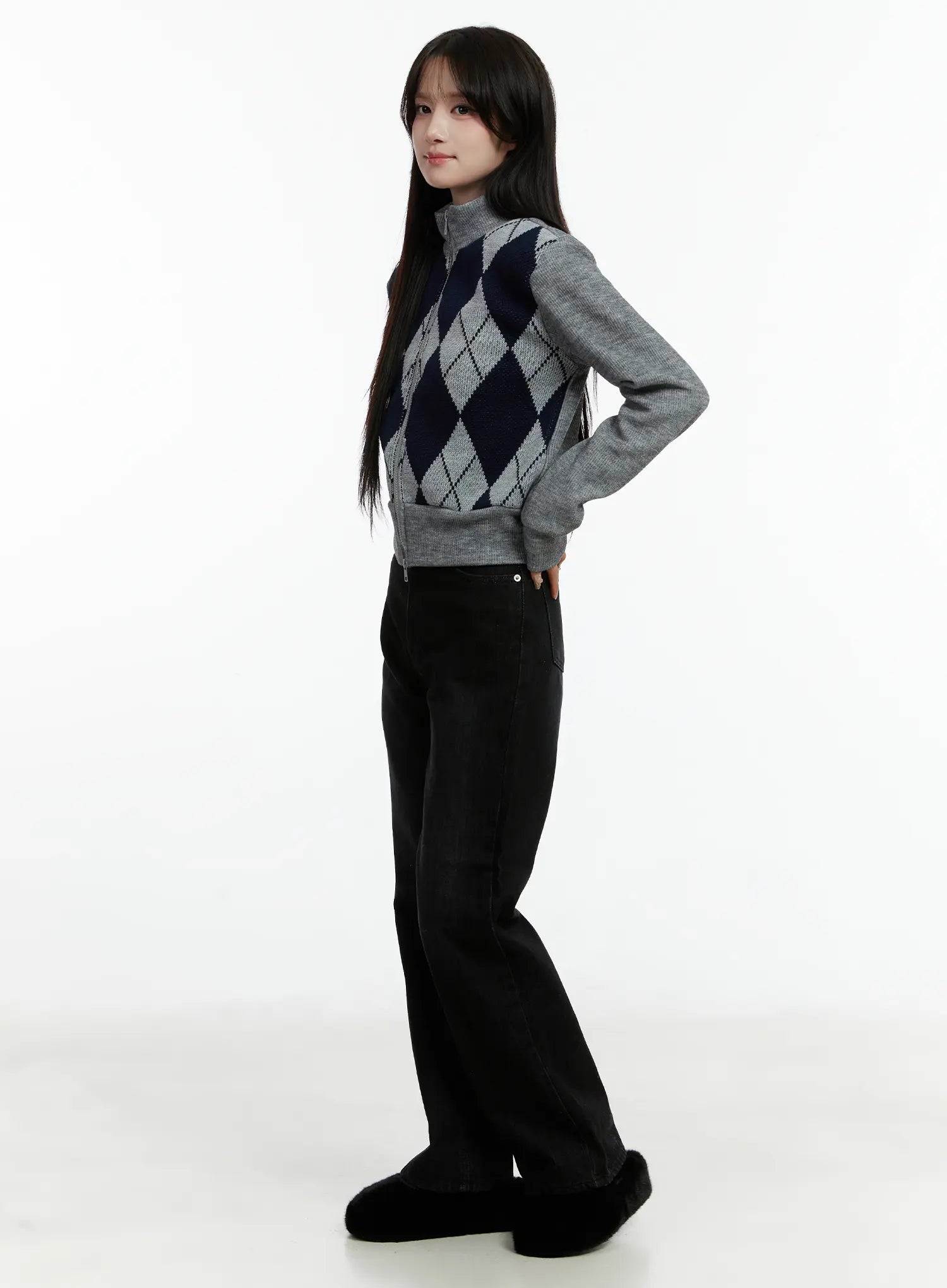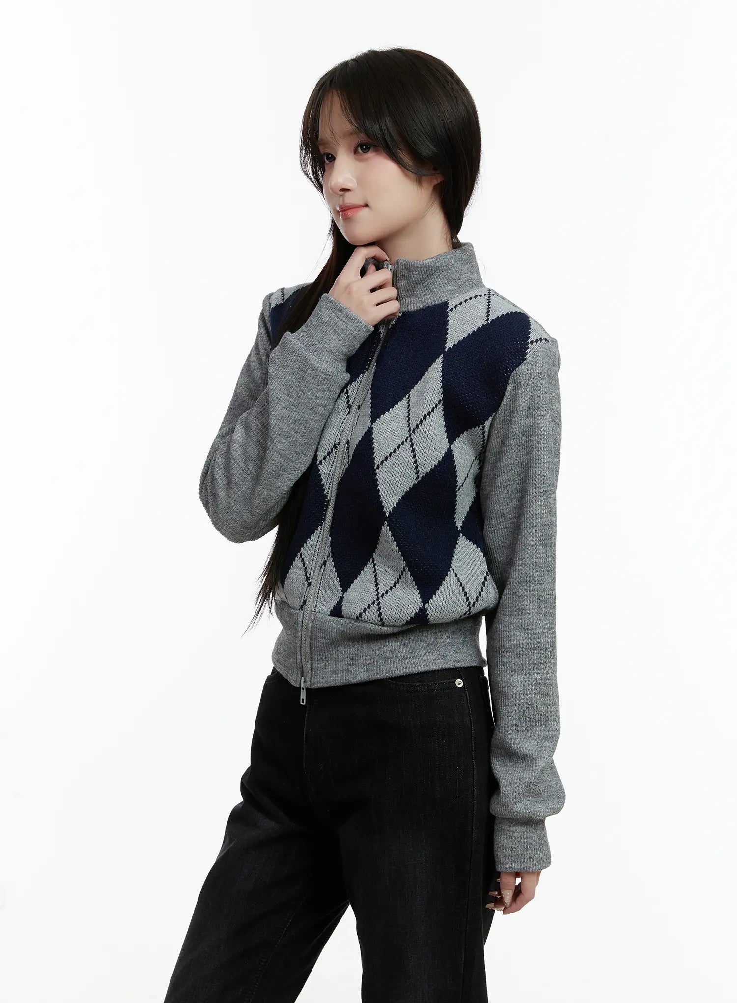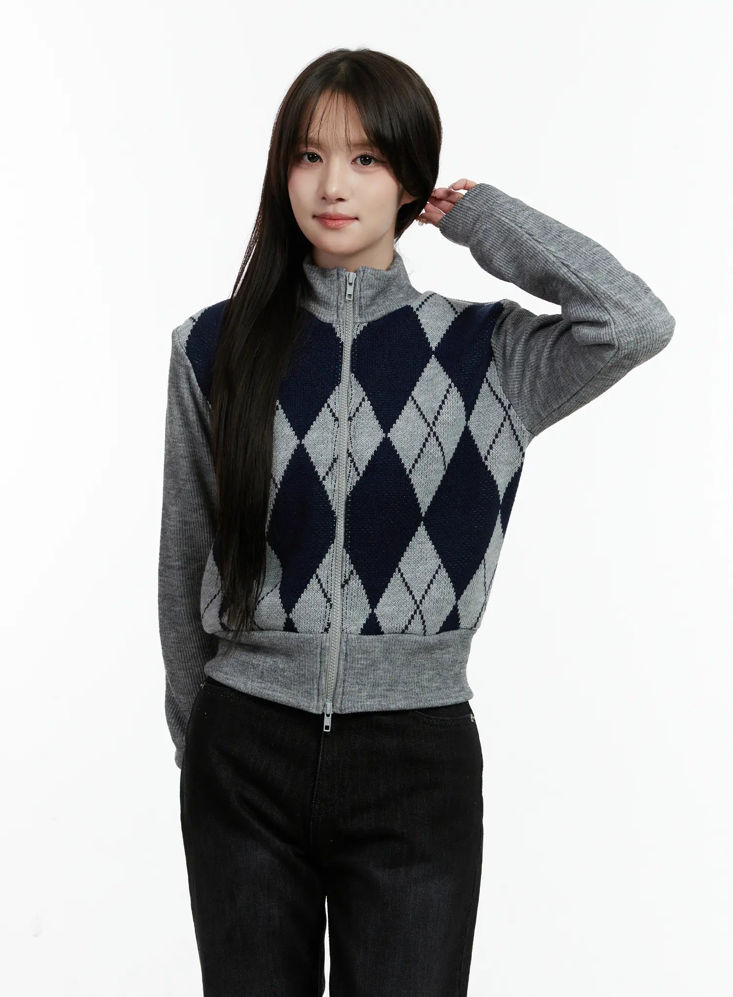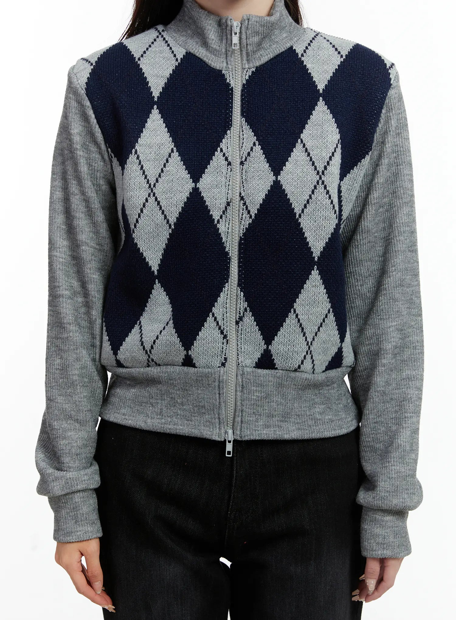 Argyle Pattern Knit Zip-Up Sweater CD523