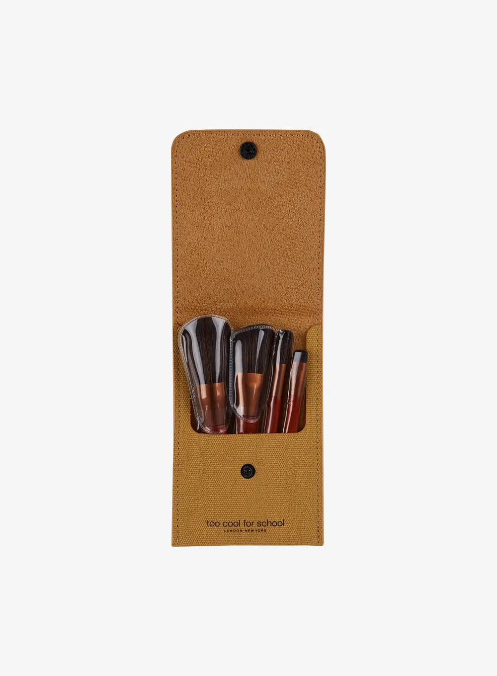 A vegan-friendly brush kit with four essential makeup brushes in a portable pouch.