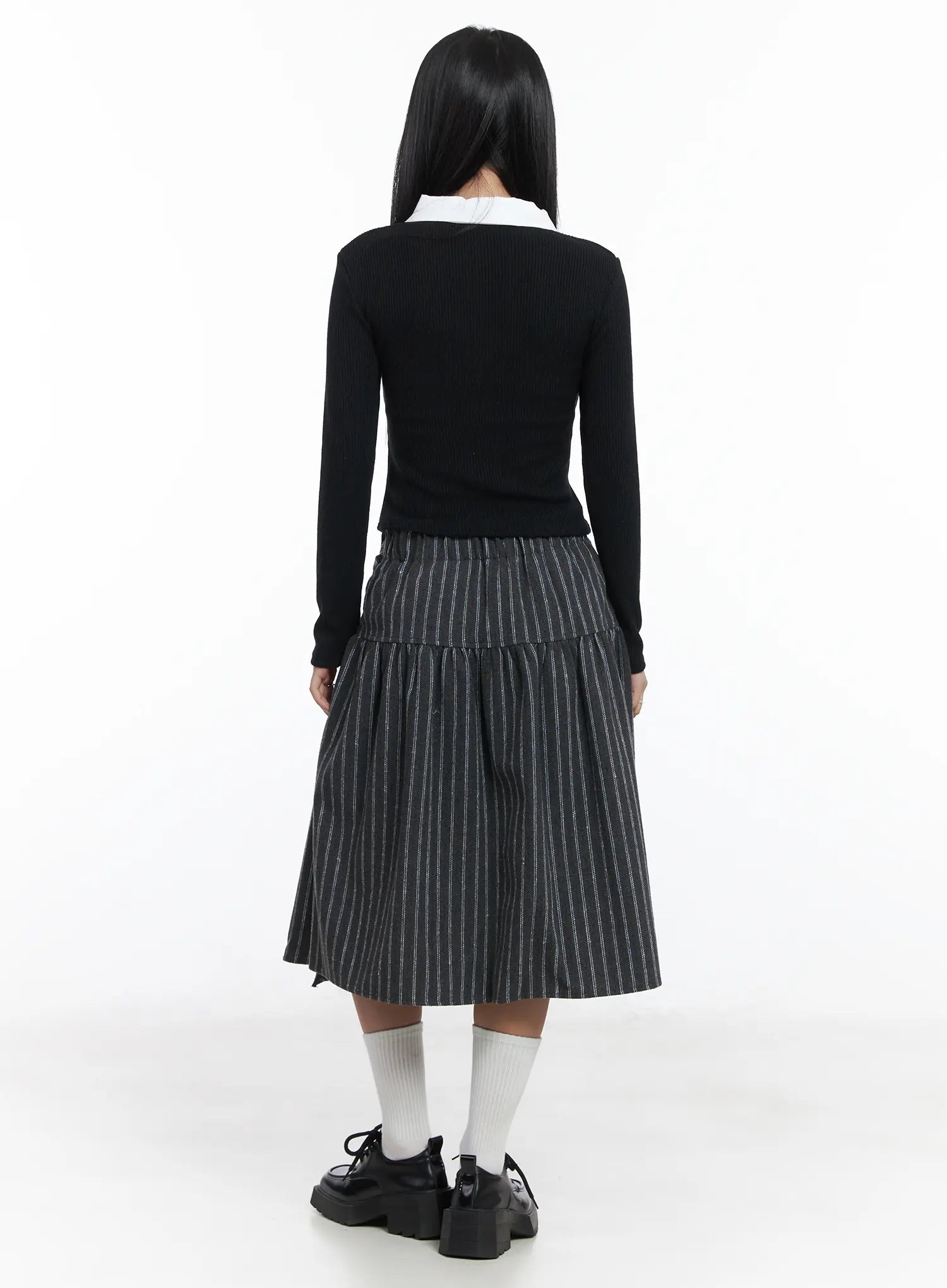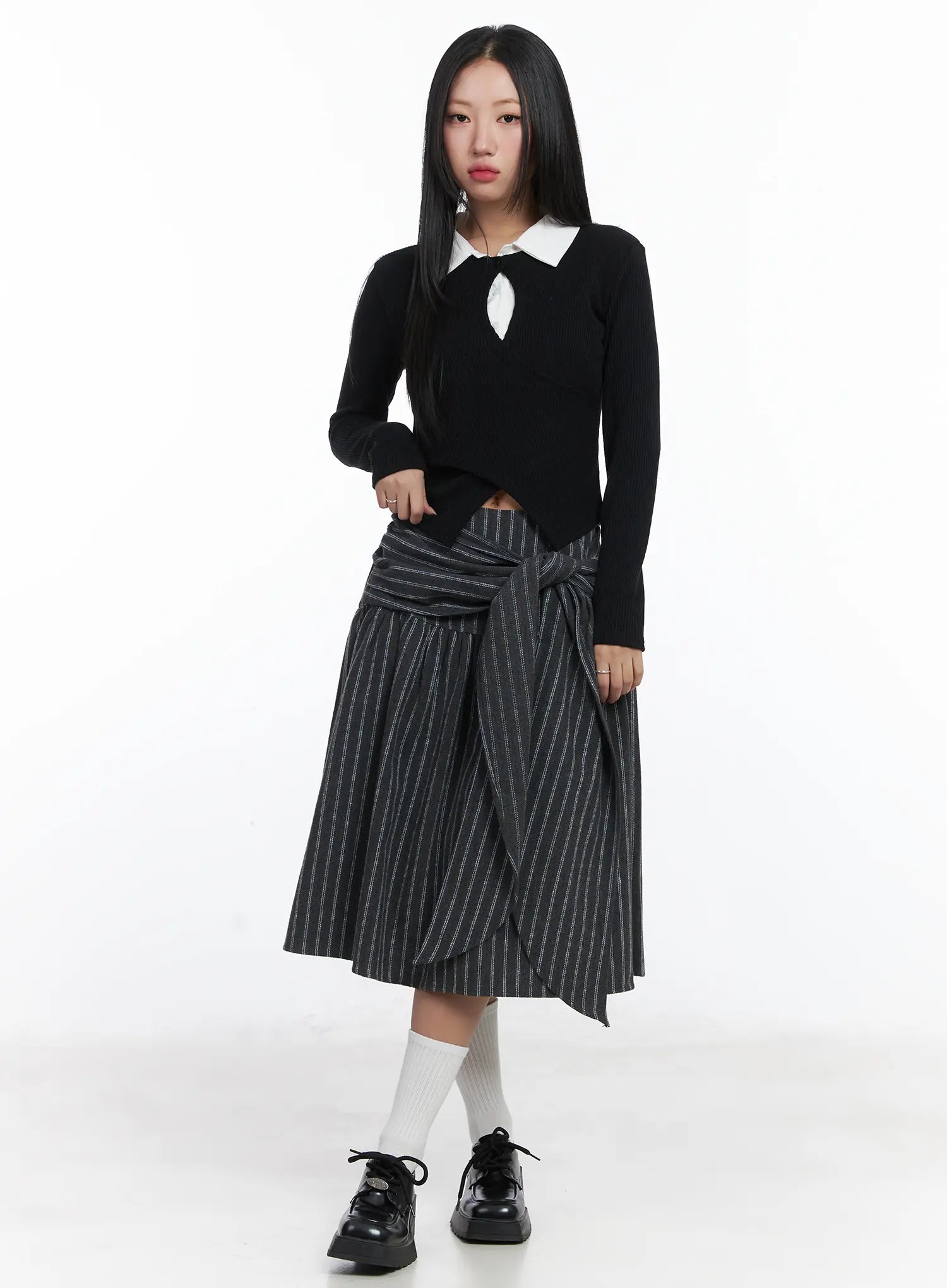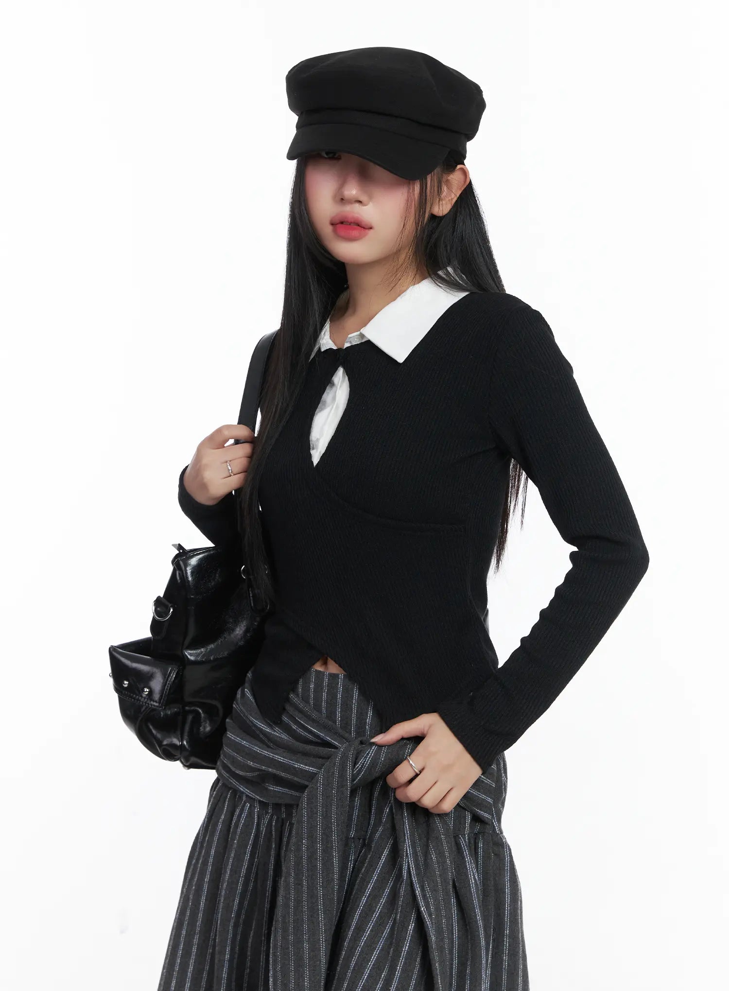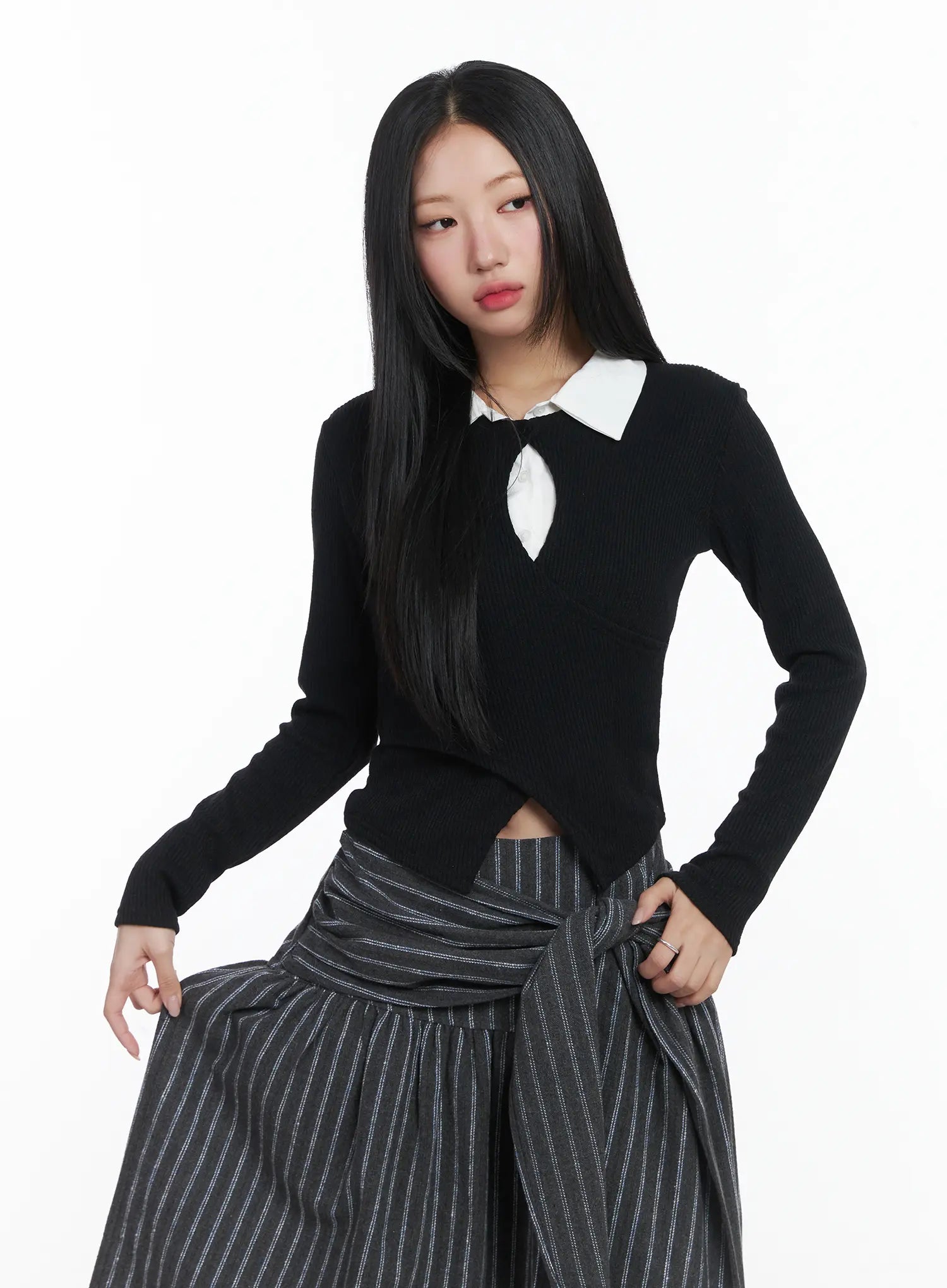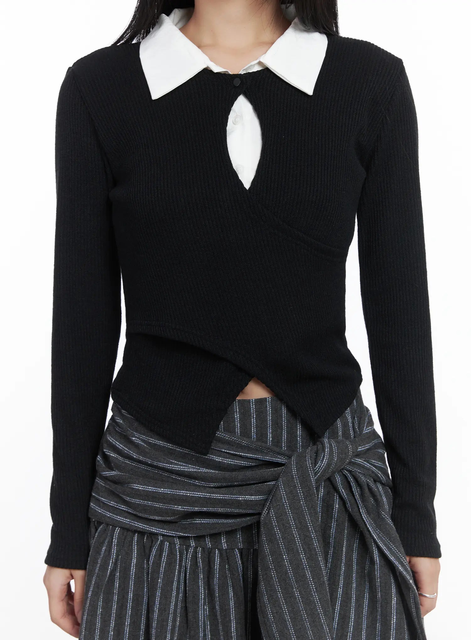 Button Wrap Collar Ribbed Long Sleeve Top CD529