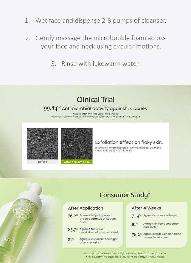 Gently massage 2-3 pumps of cleansing foam onto face and neck, then rinse thoroughly with lukewarm water.