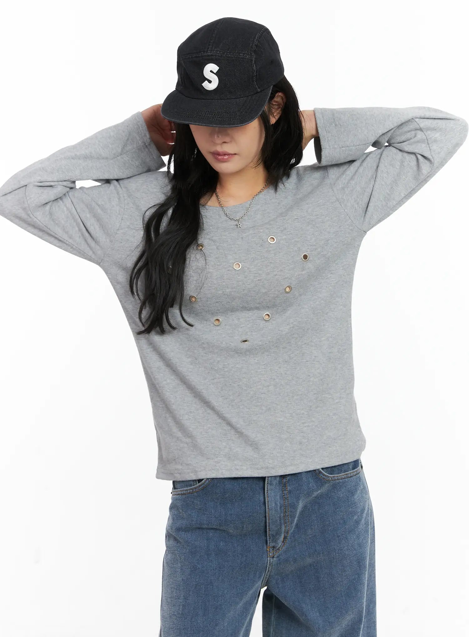 Eyelet Heart Boatneck Long Sleeve Tee CN528