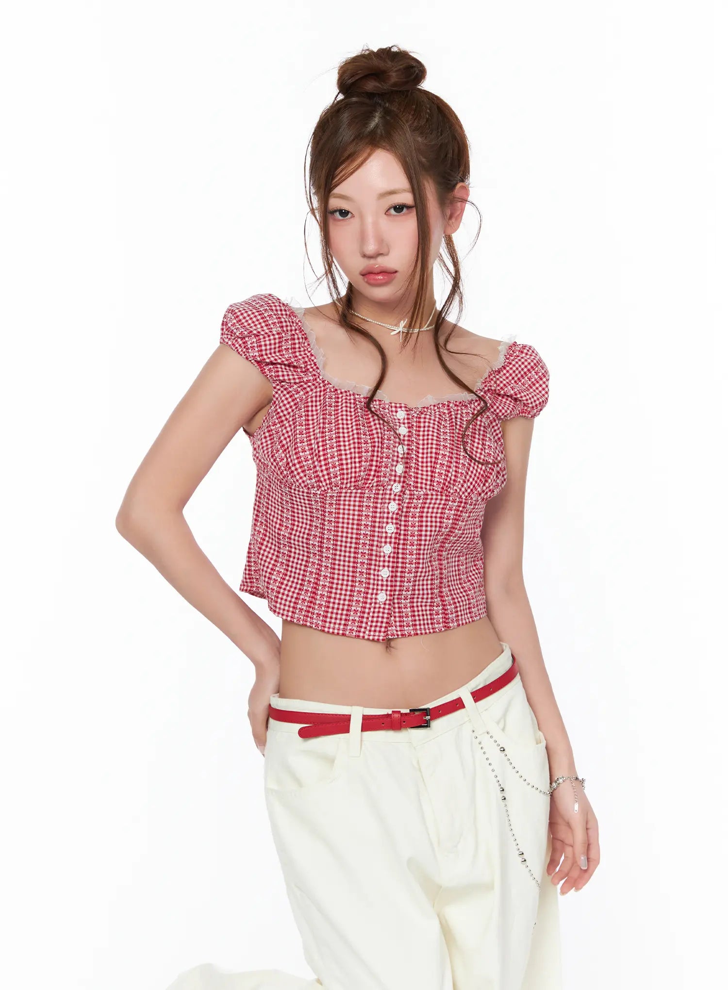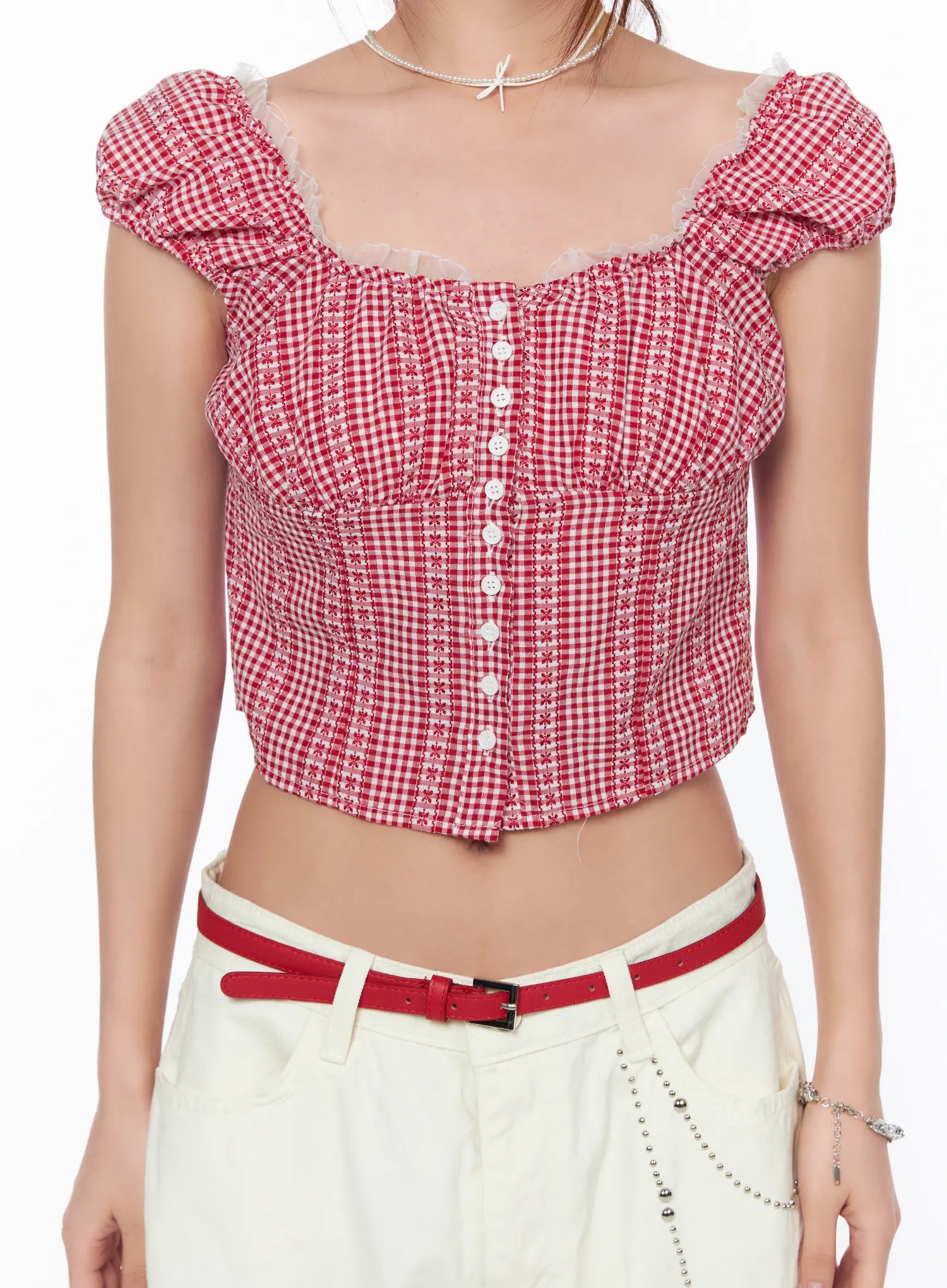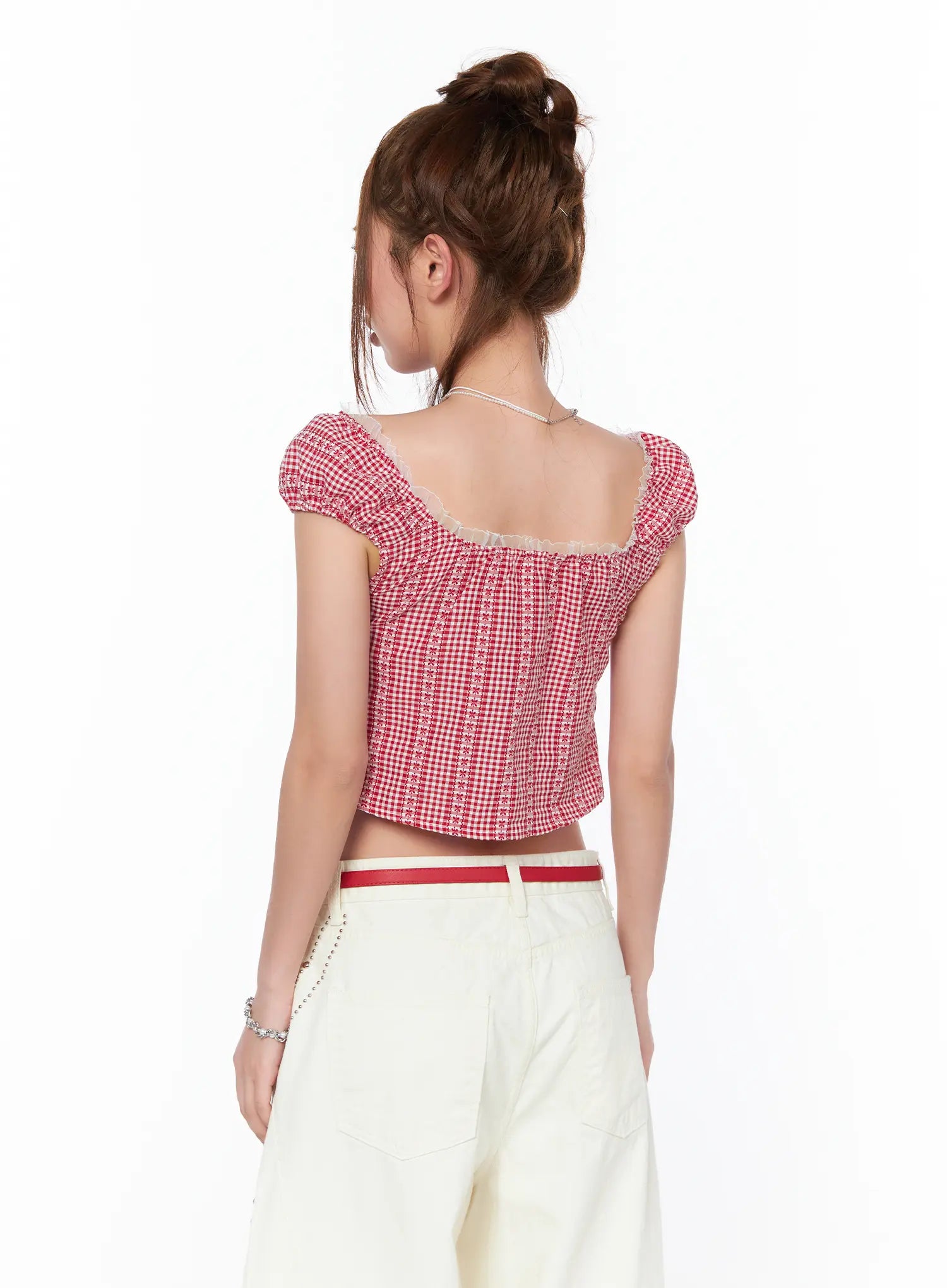 Frill Trimmed Gingham Short Sleeve Blouse CA514