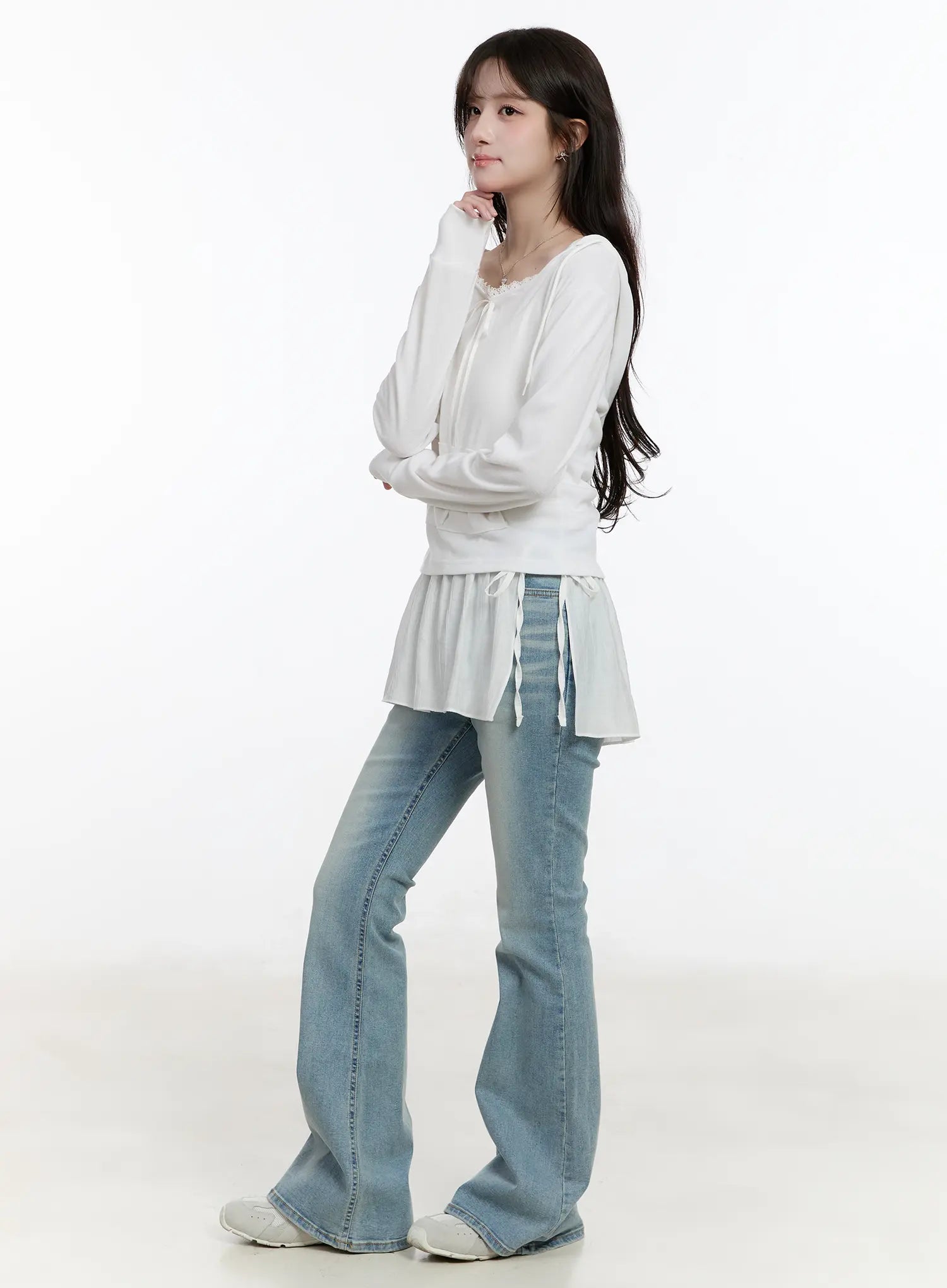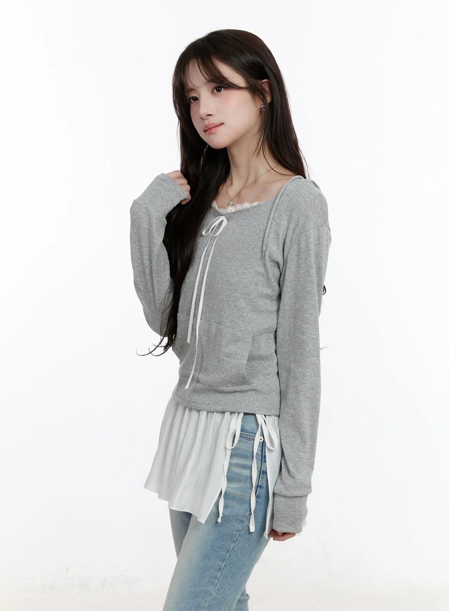 Lace Ribbon Hooded Long Sleeve Top CM505