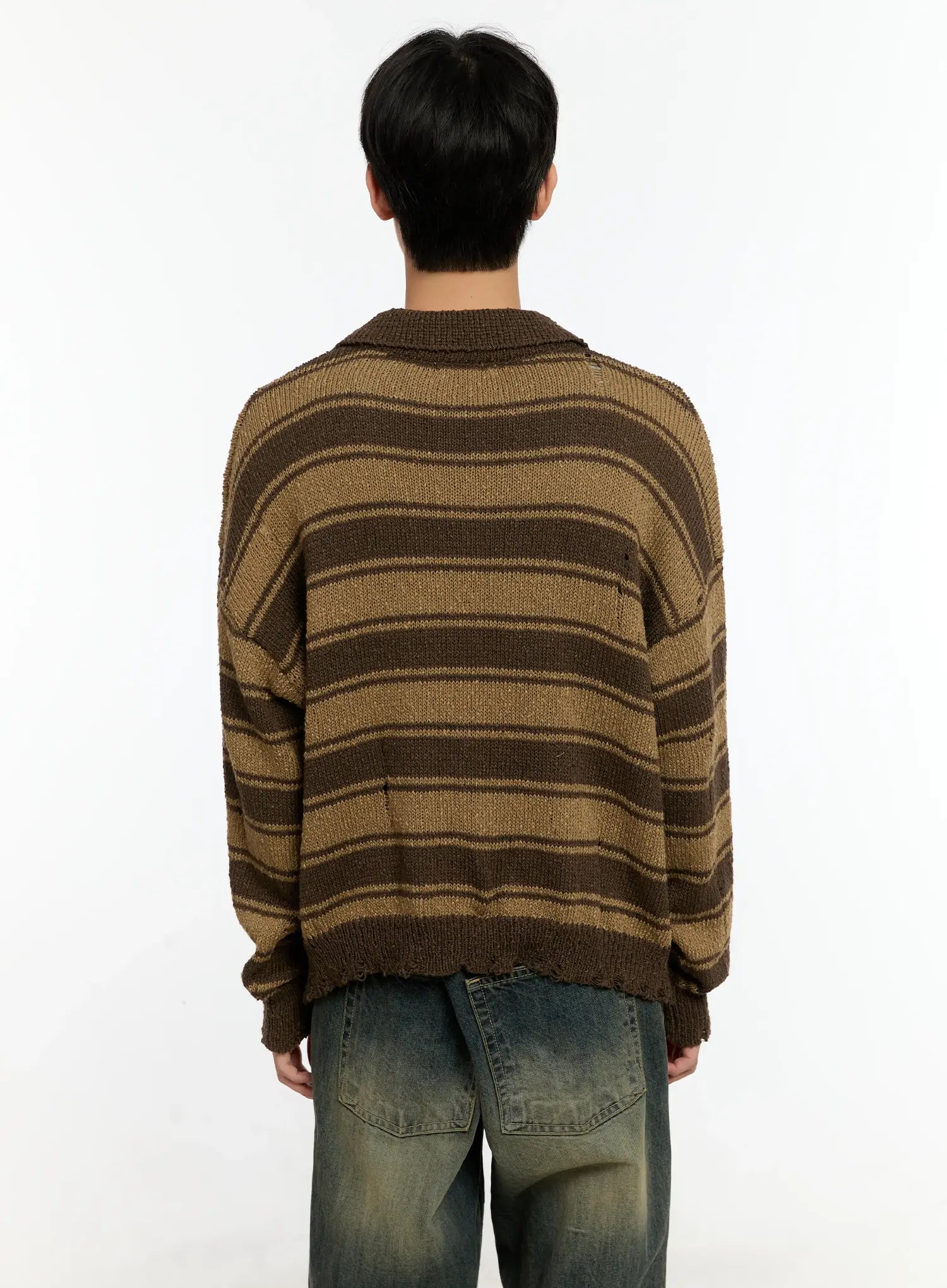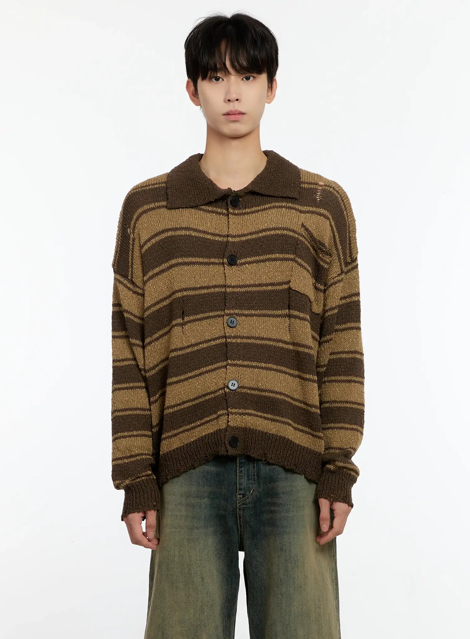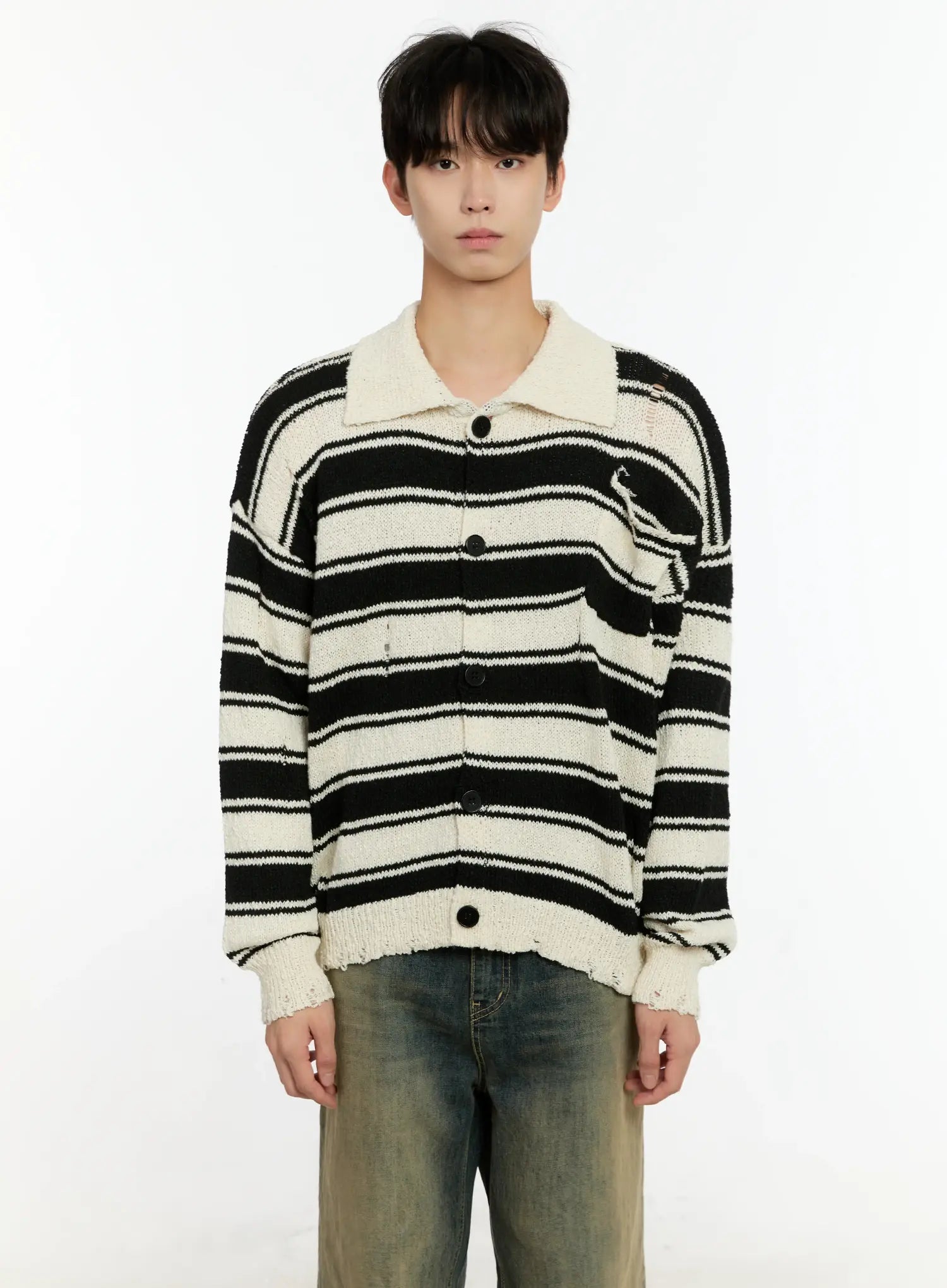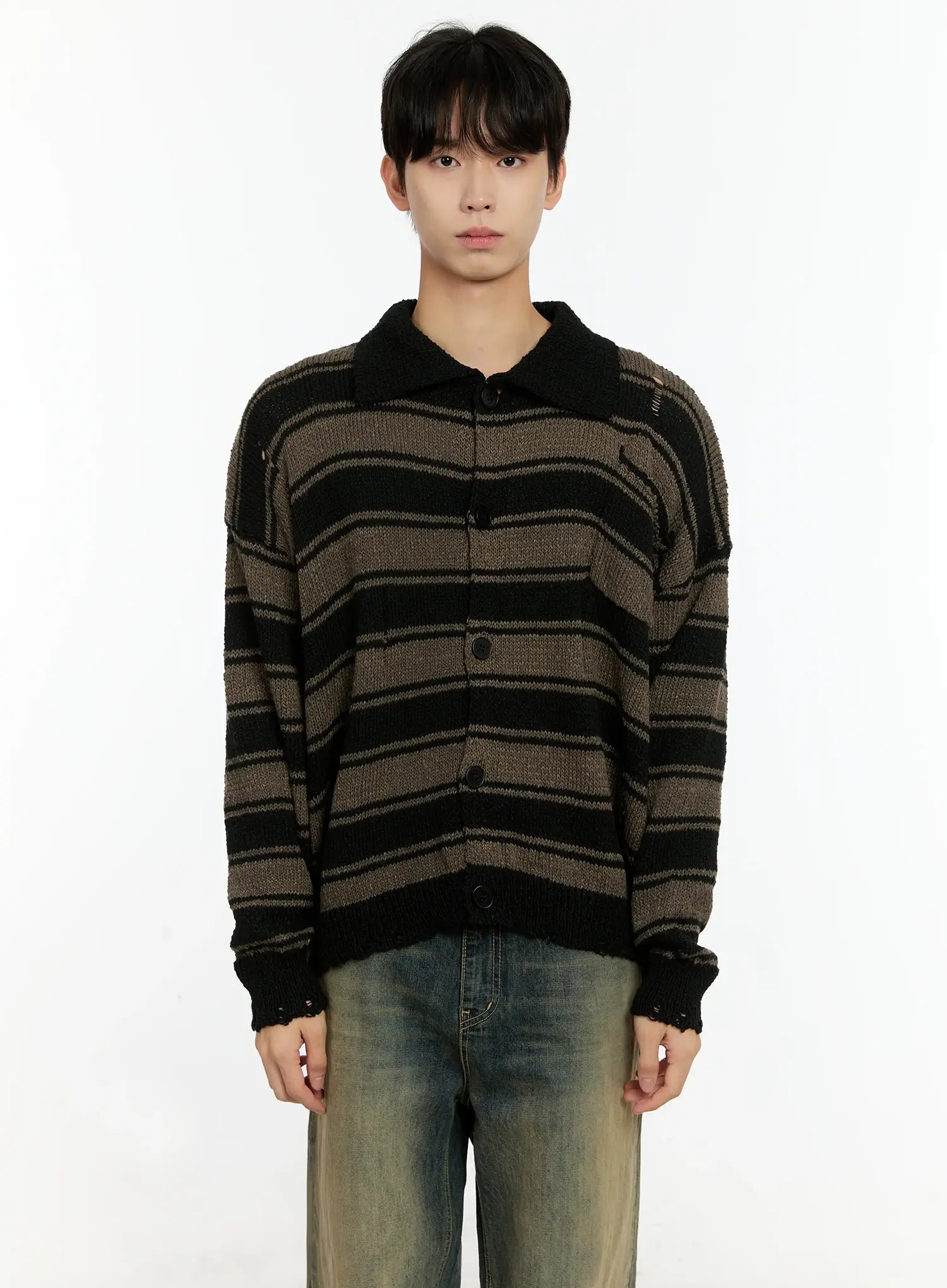 Men's Striped Distressed Collared Cardigan IN503