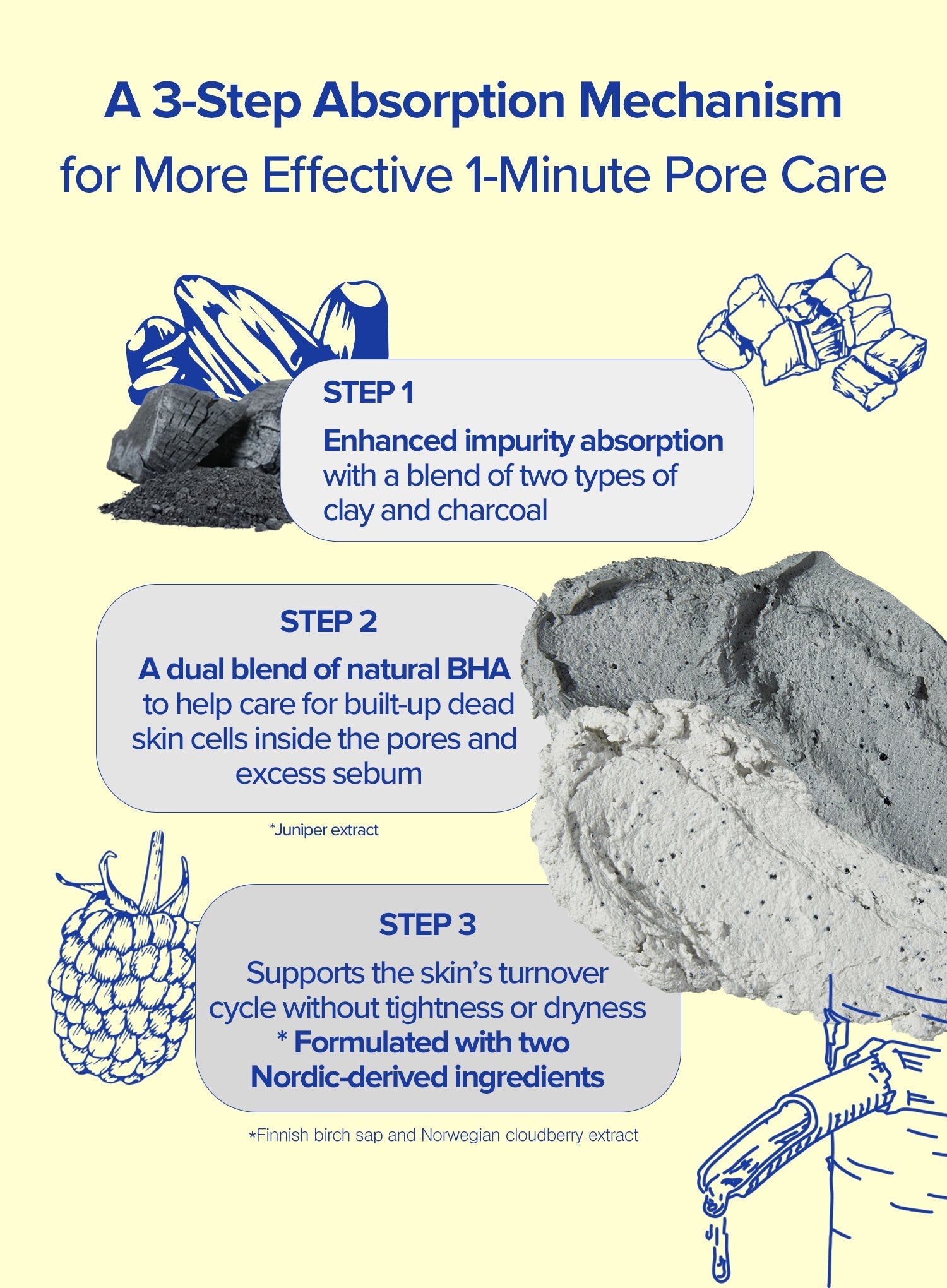 - Two types of clay and charcoal absorb impurities for clearer-looking skin.