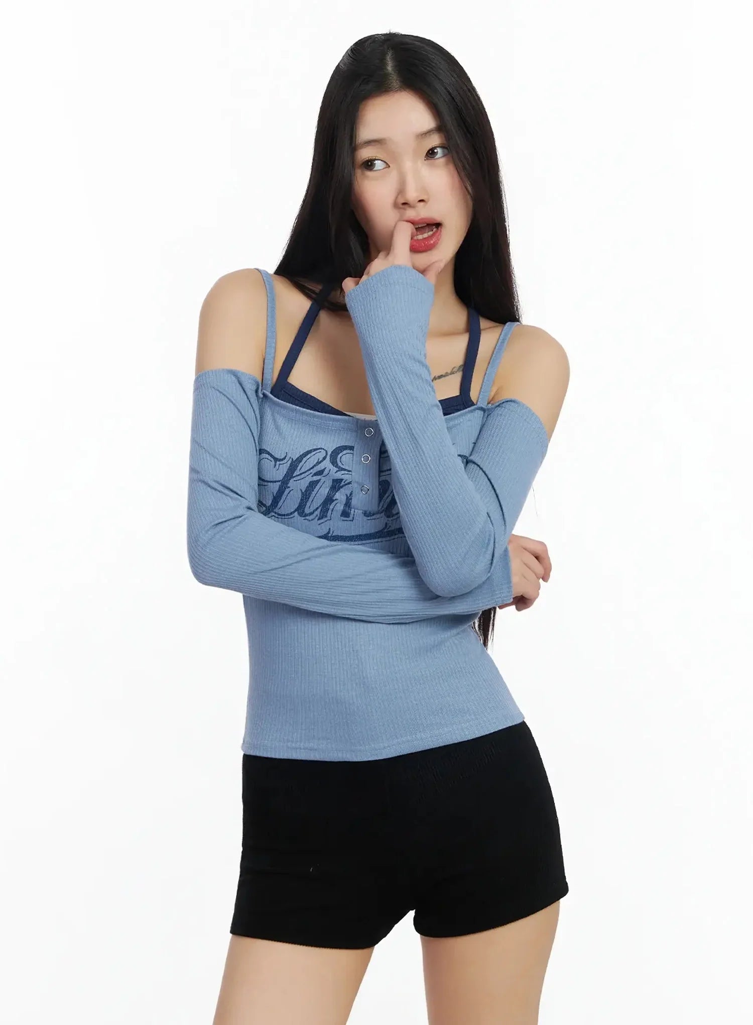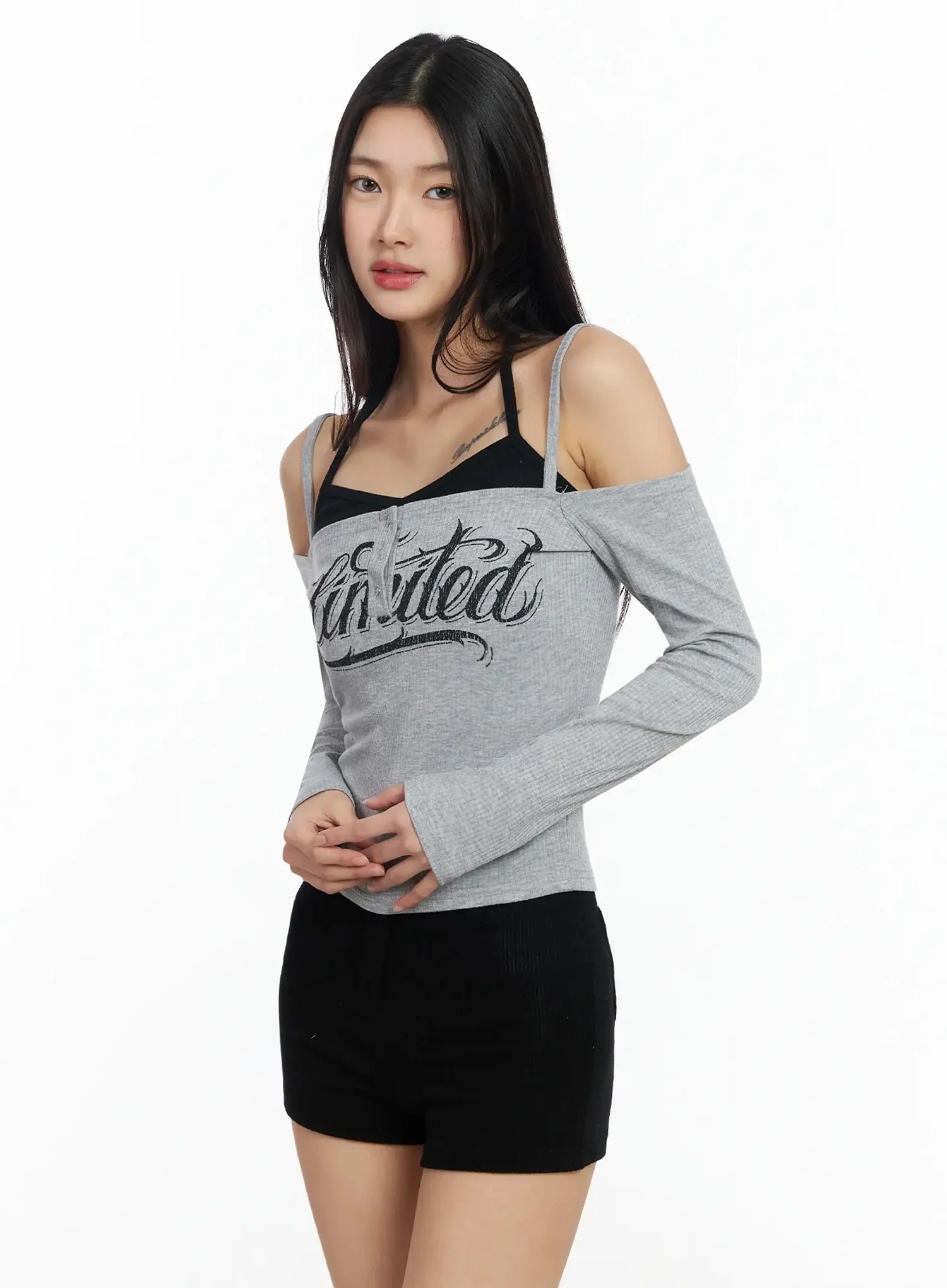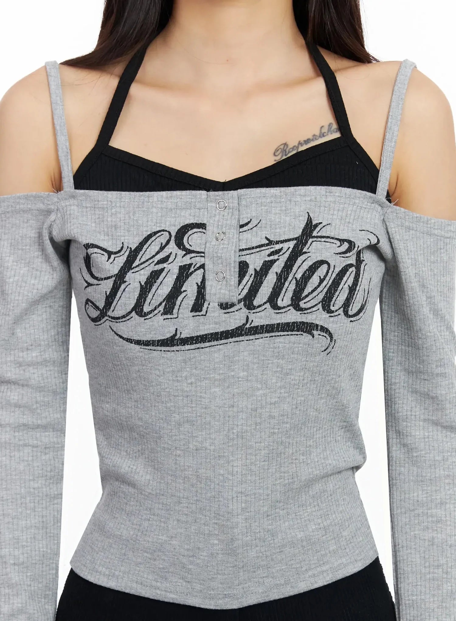 Off-Shoulder Graphic Layered Tee IA508