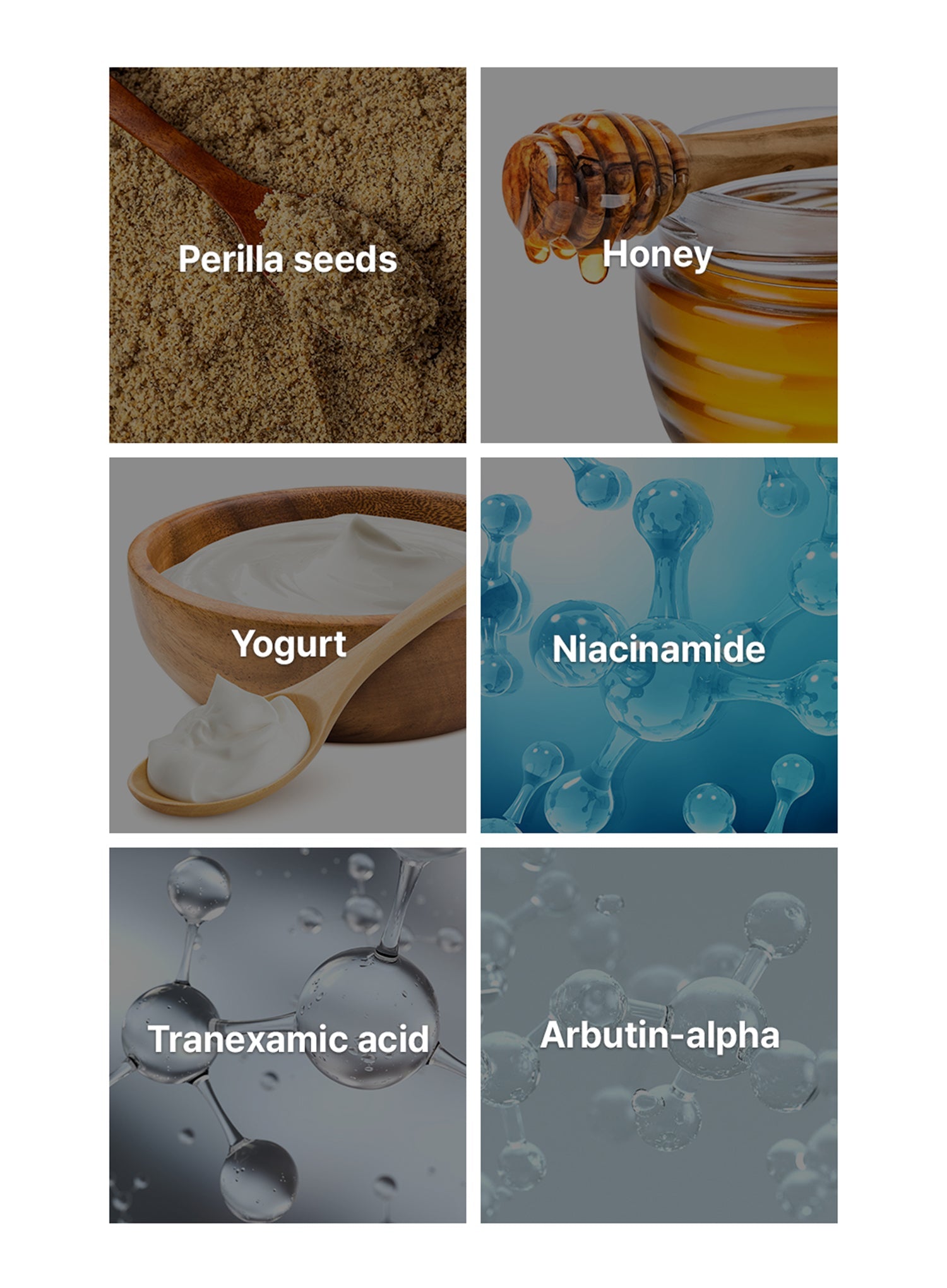 Water, Glycerin, Niacinamide, Isopentyldiol, Perilla Ocymoides Seed Extract, 1,2-Hexanediol, Arginine, Trehalose, Carbomer, Acrylates/C10-30 Alkyl Acrylate Crosspolymer, Hydroxyacetophenone, C12-14 Alketh-12, Ethylhexylglycerin, Caprylyl Glycol, Adenosine, Xanthan Gum, Butylene Glycol, Melia Azadirachta Leaf Extract, Melia Azadirachta Flower Extract, Disodium EDTA, Alpha-Arbutin, Tranexamic Acid, Honey Extract, 3-O-Ethyl Ascorbic Acid, Sodium Polyacrylate, Yogurt Extract.