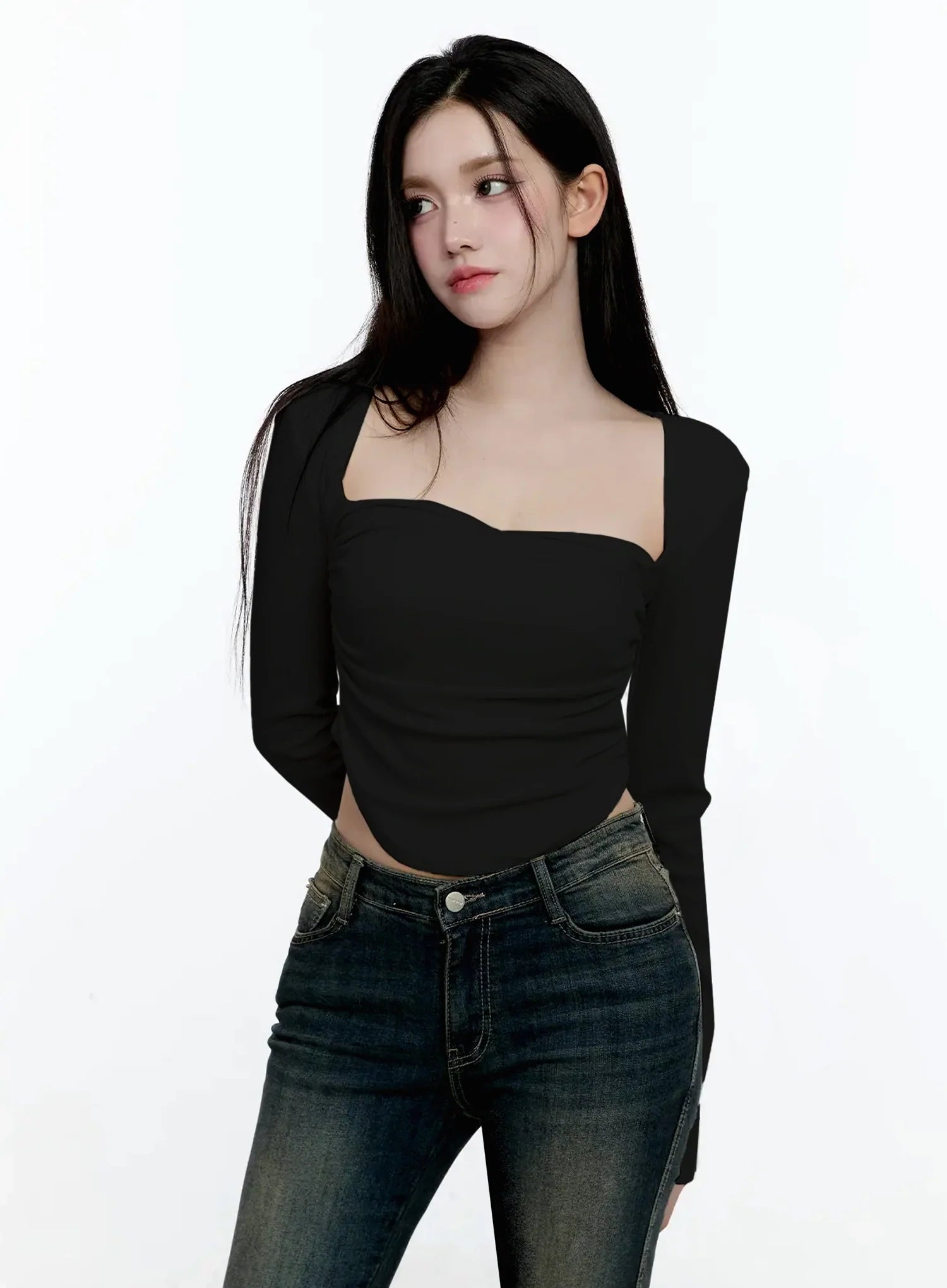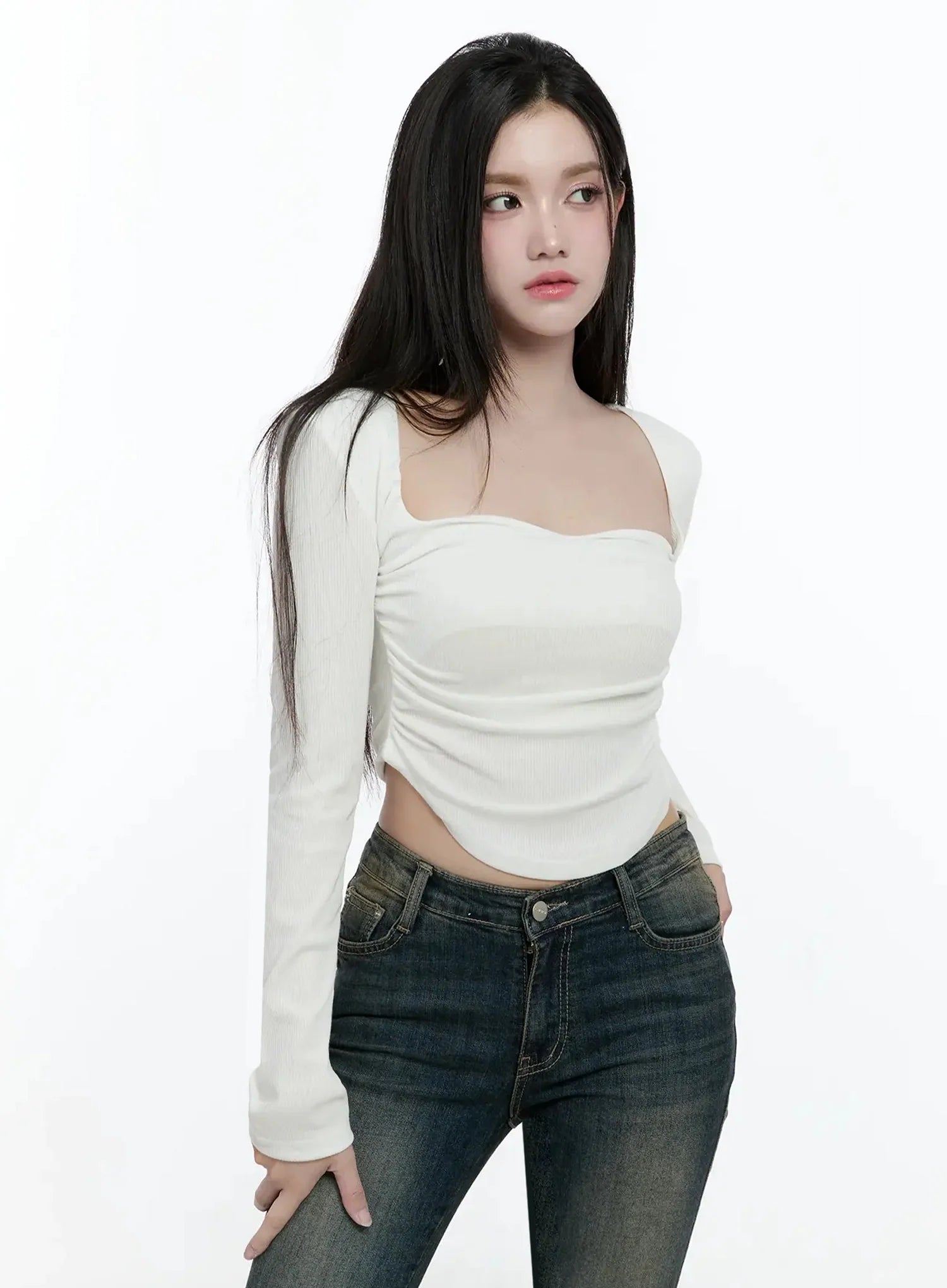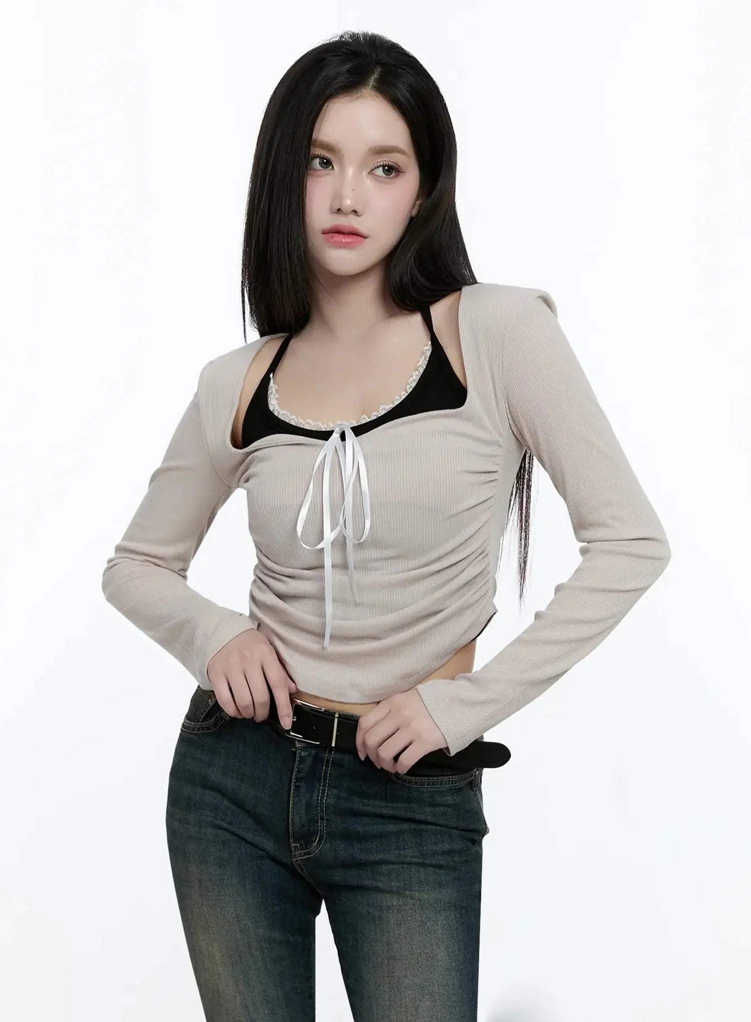 Ribbed Halterneck Shirred Long Sleeve Top IO520