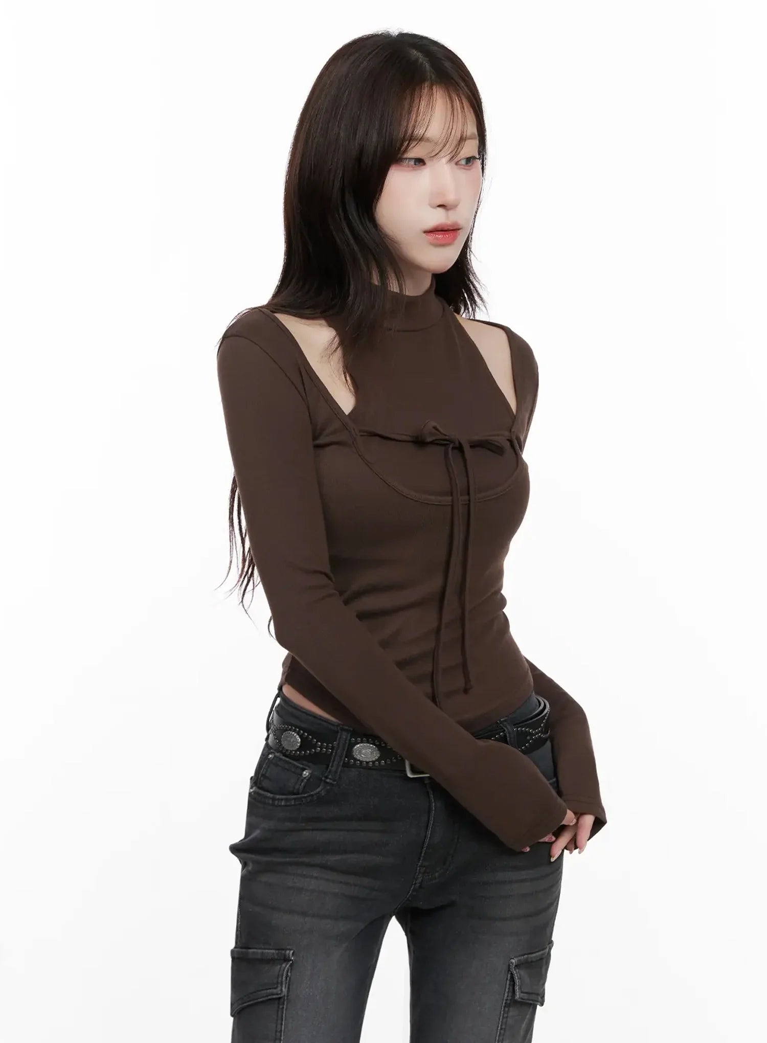 Ribbon Turtleneck Cutout Top IN514