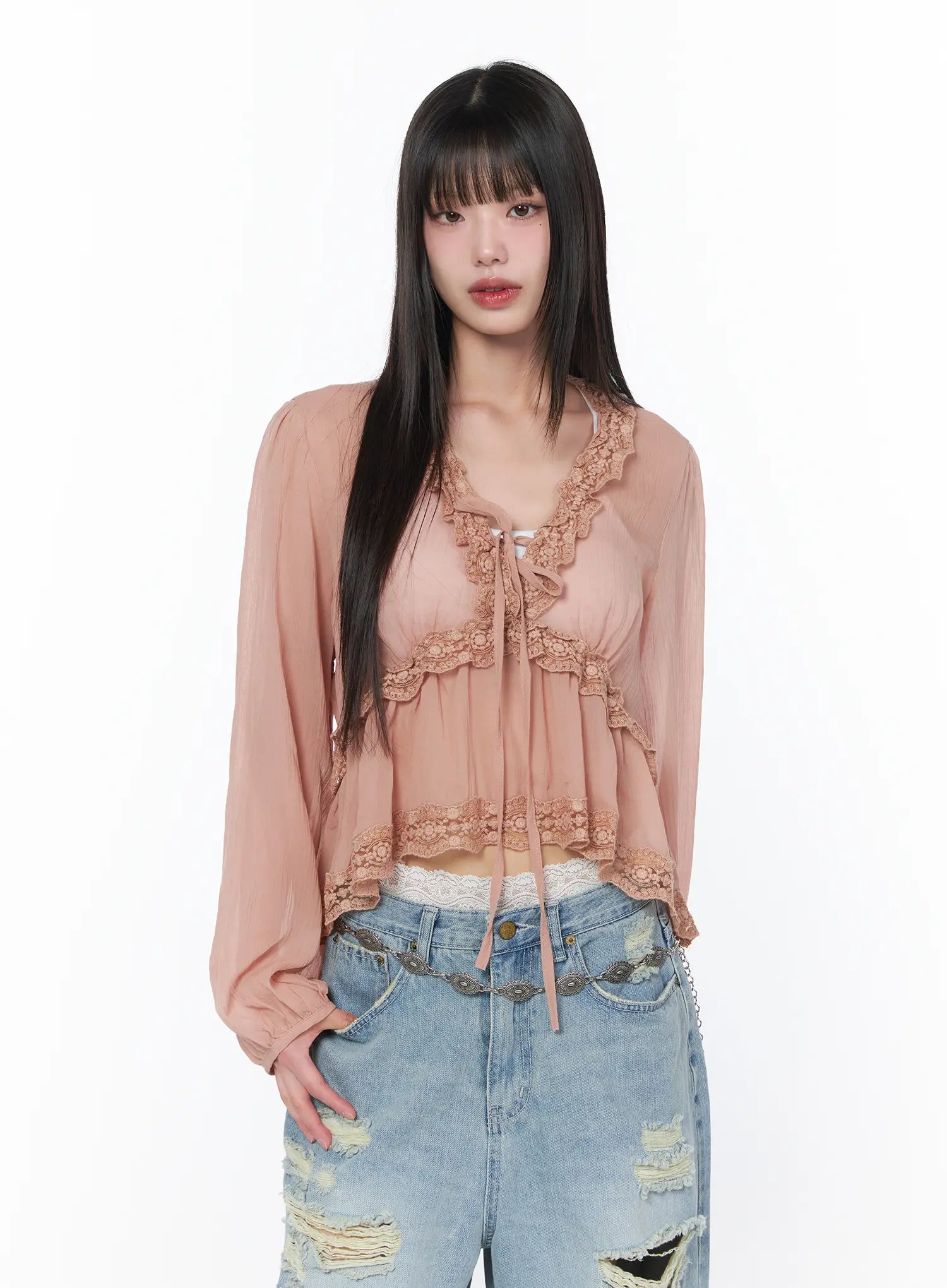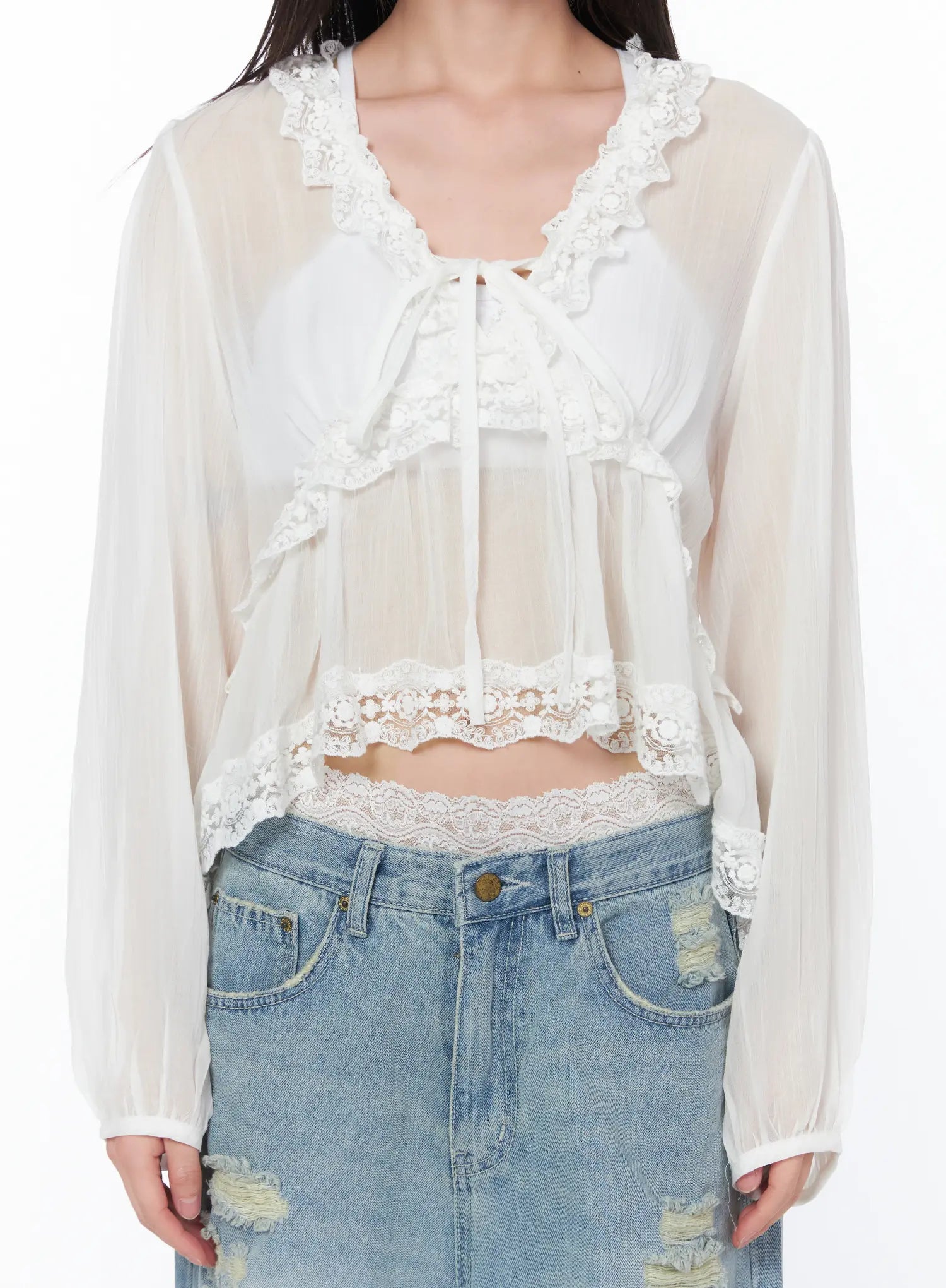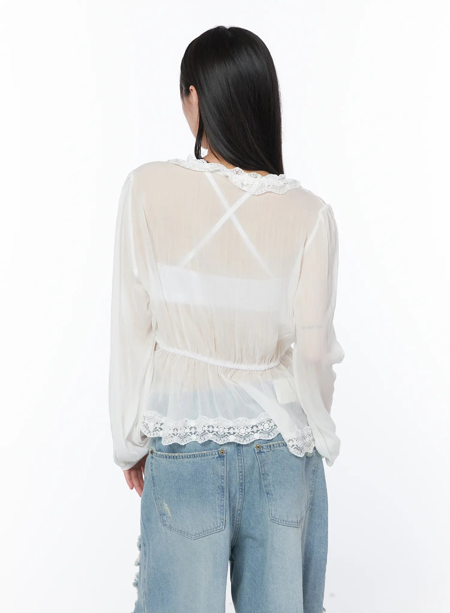 Sheer Lace V-Neck Ruffle Blouse CA528