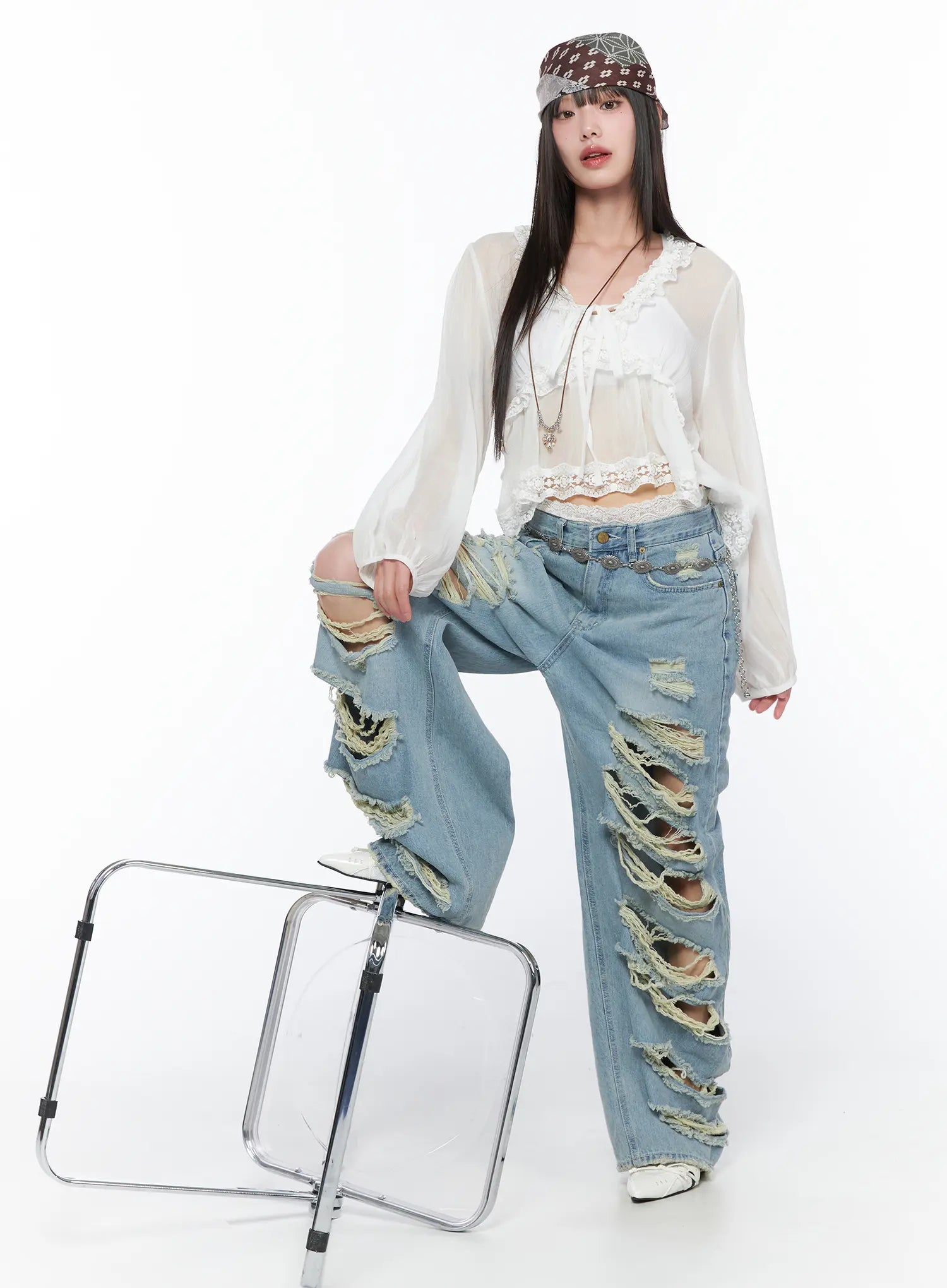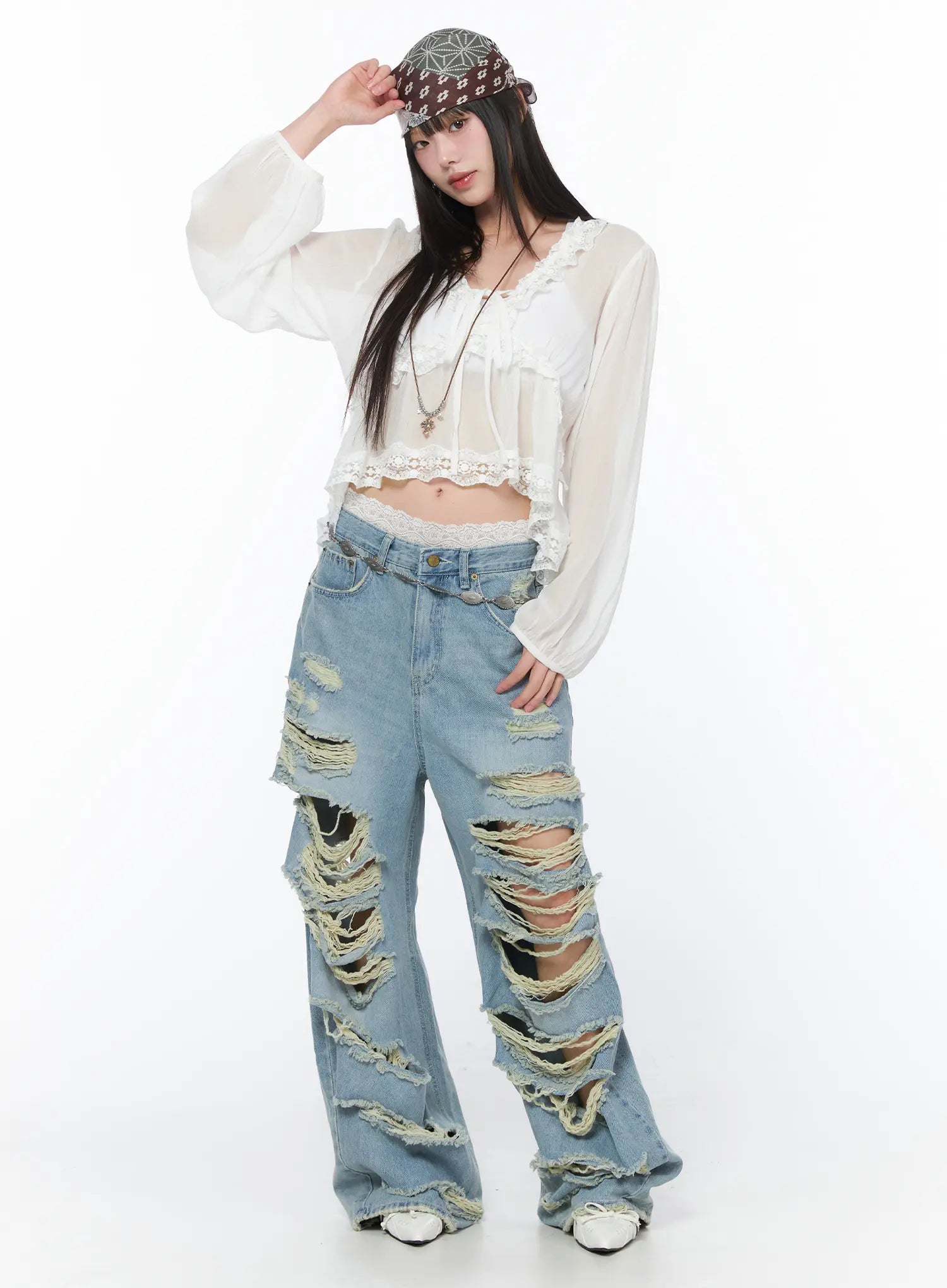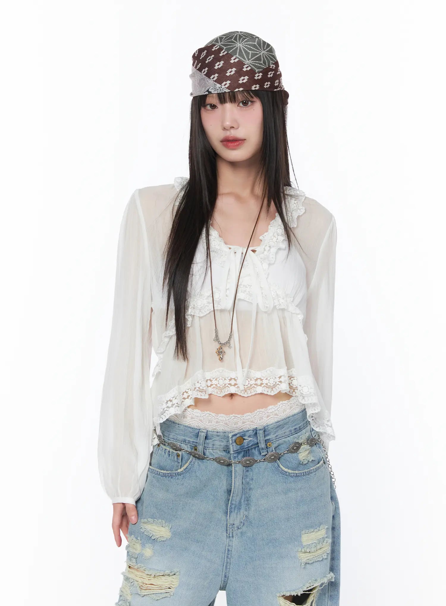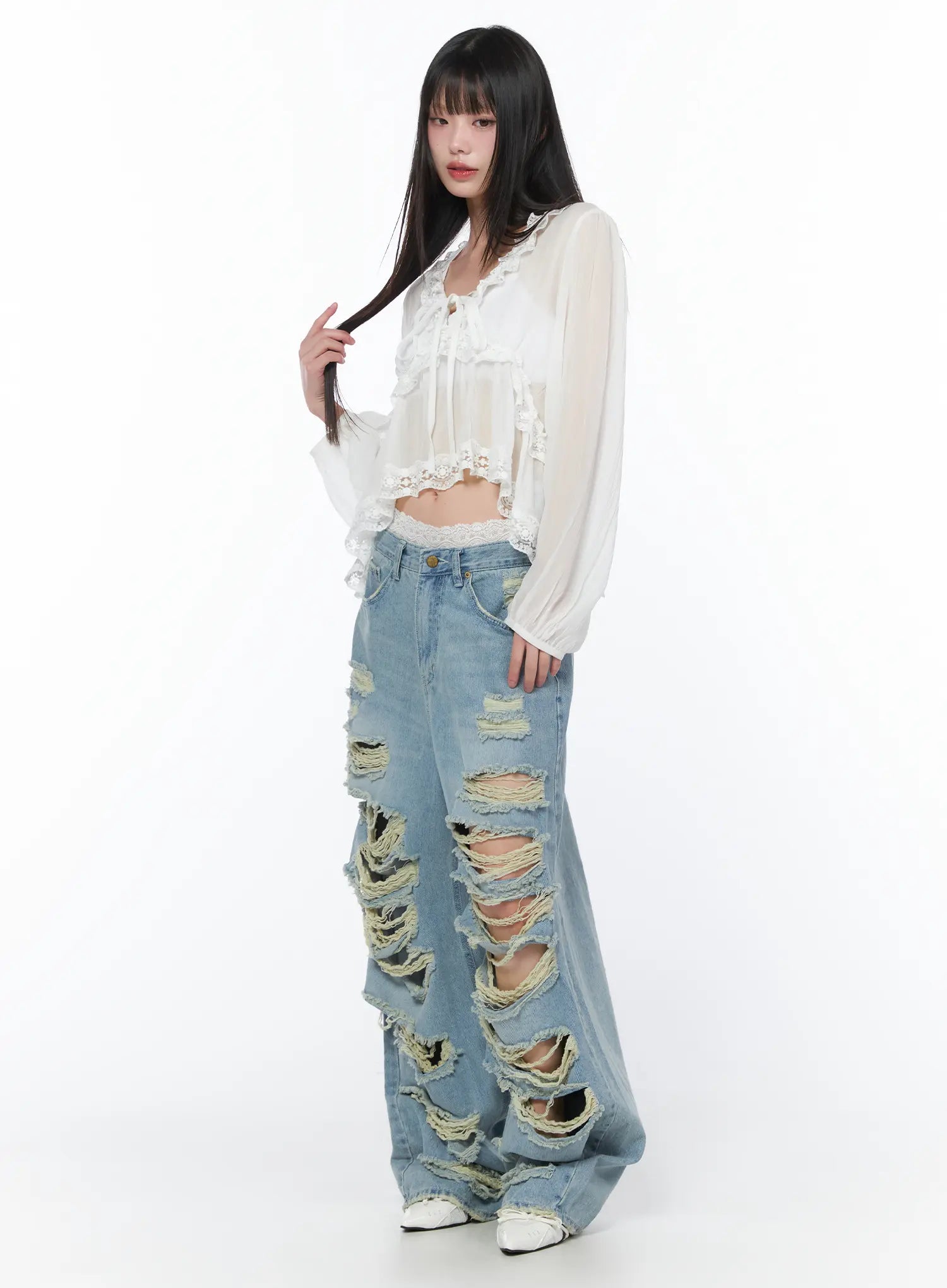 Sheer Lace V-Neck Ruffle Blouse CA528
