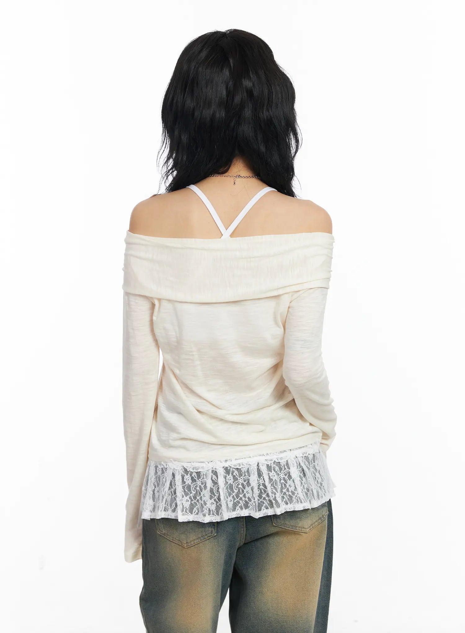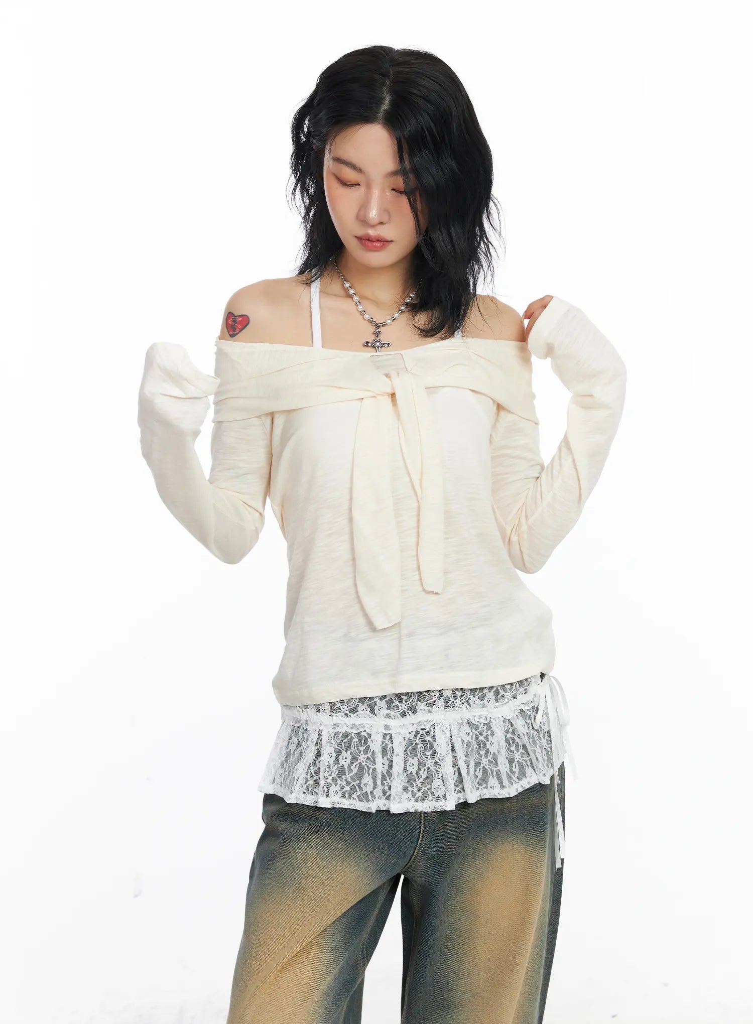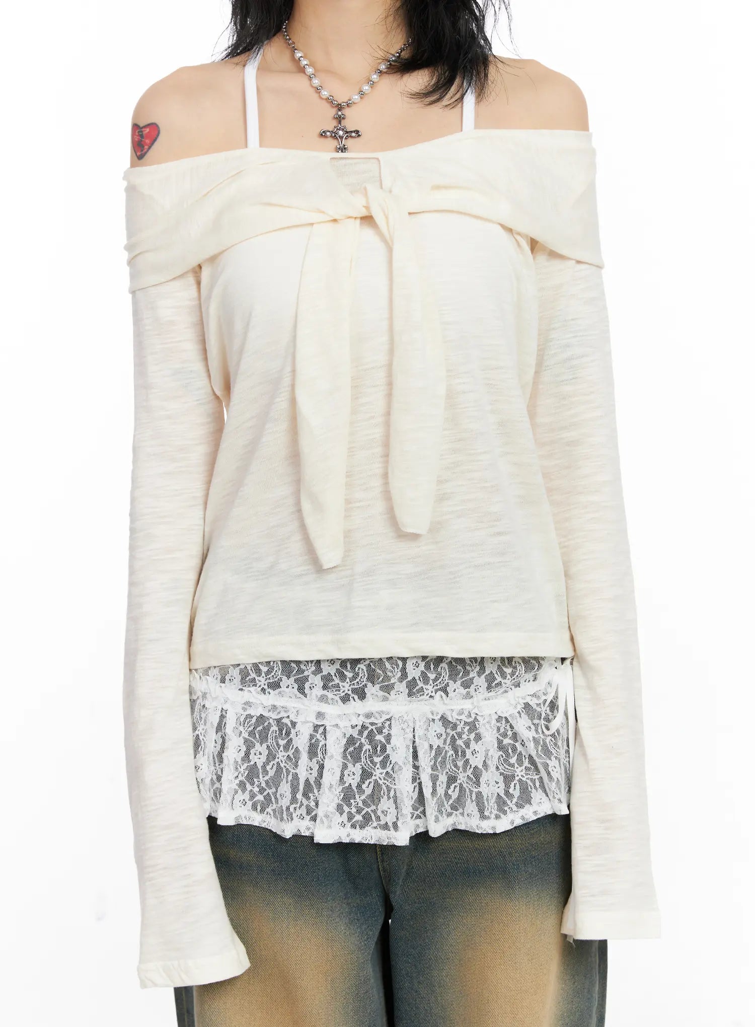 Sheer Ribbon Off-Shoulder Long Sleeve Top CJ522