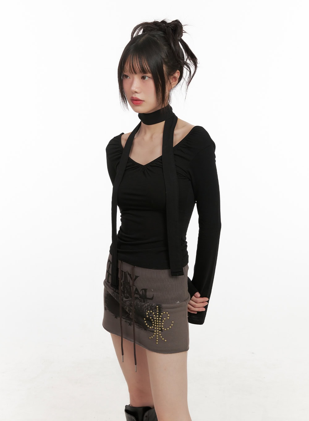 Shirred V-Neck Long-Sleeve Top with Scarf CJ502