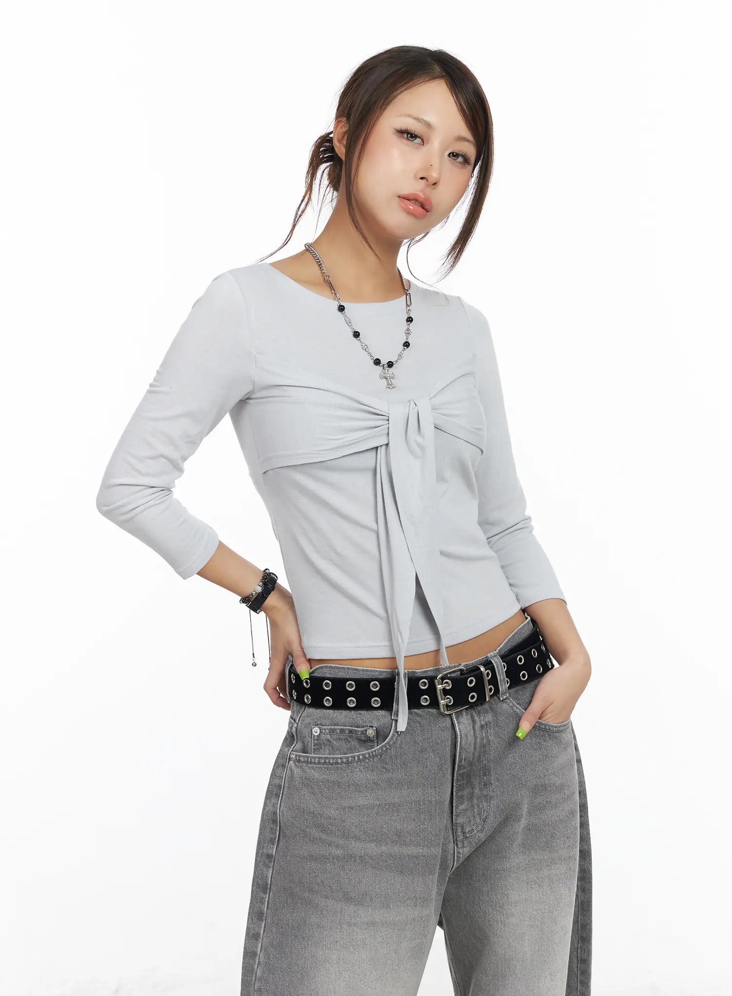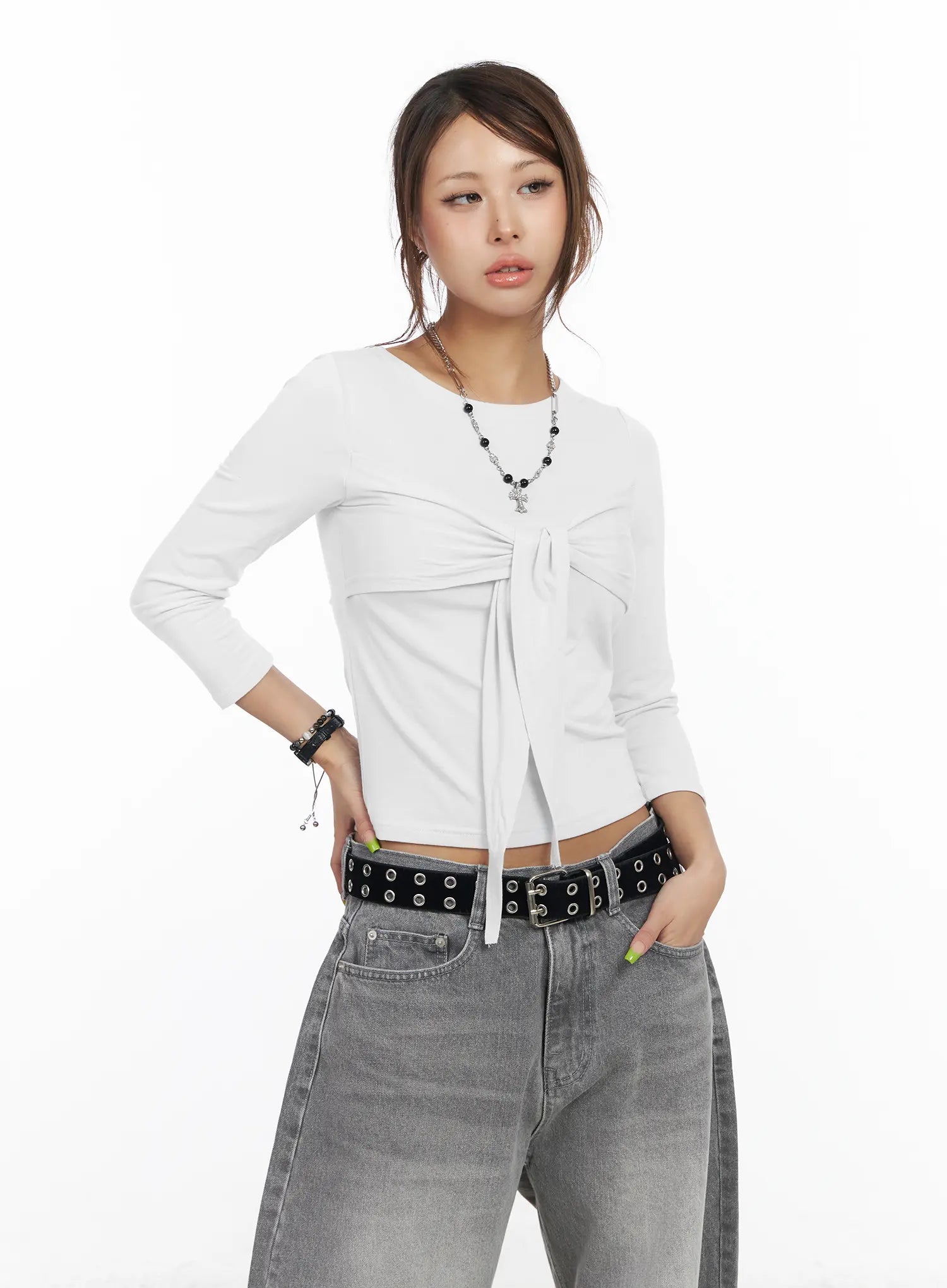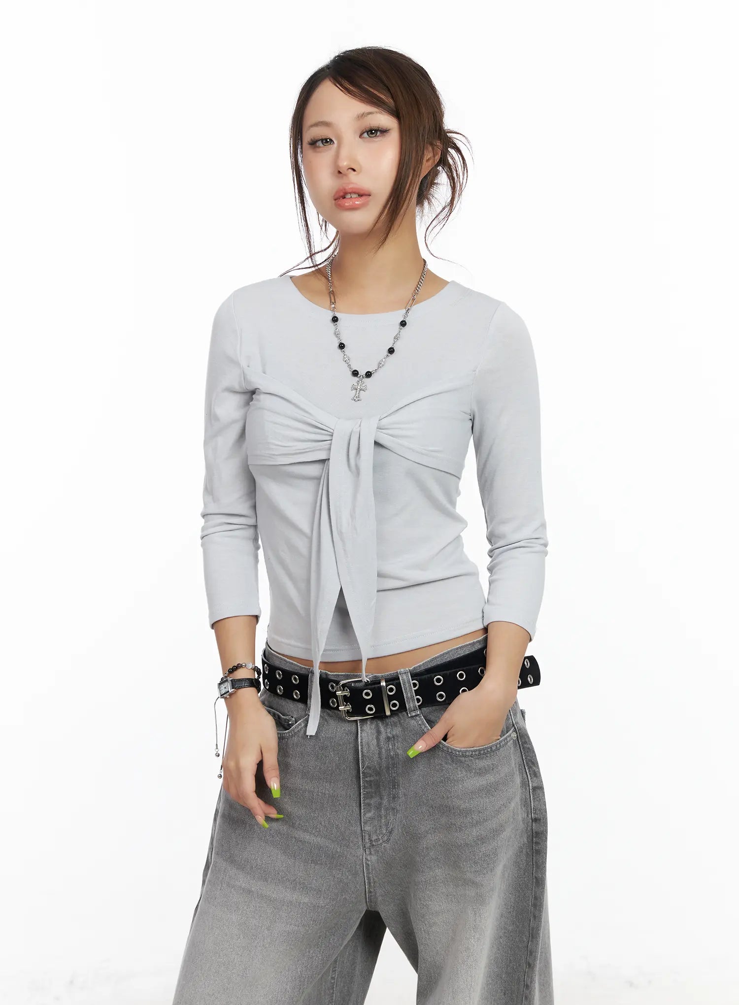 U-Neck Ribbon Tie 3/4 Sleeve Top CF511