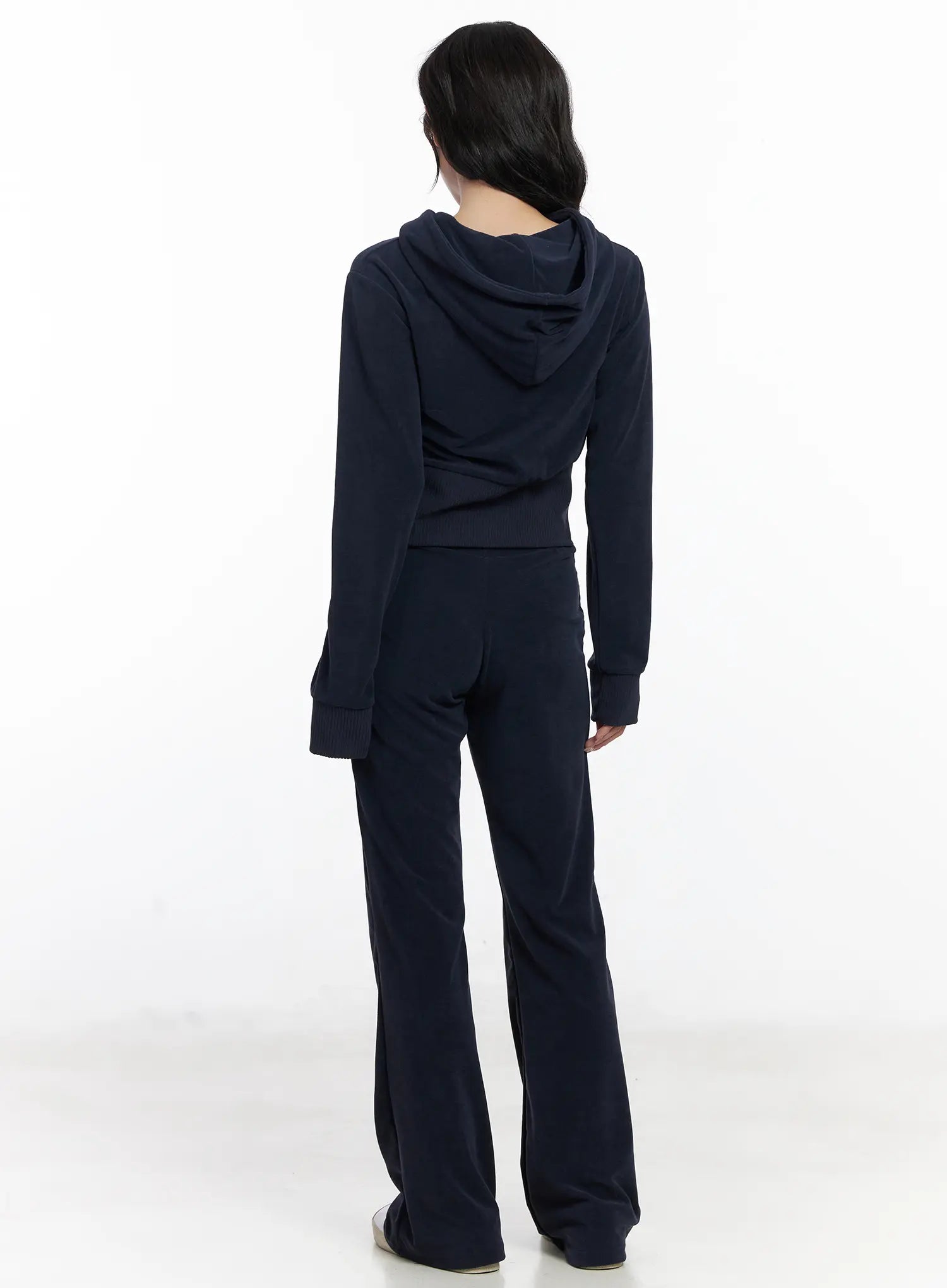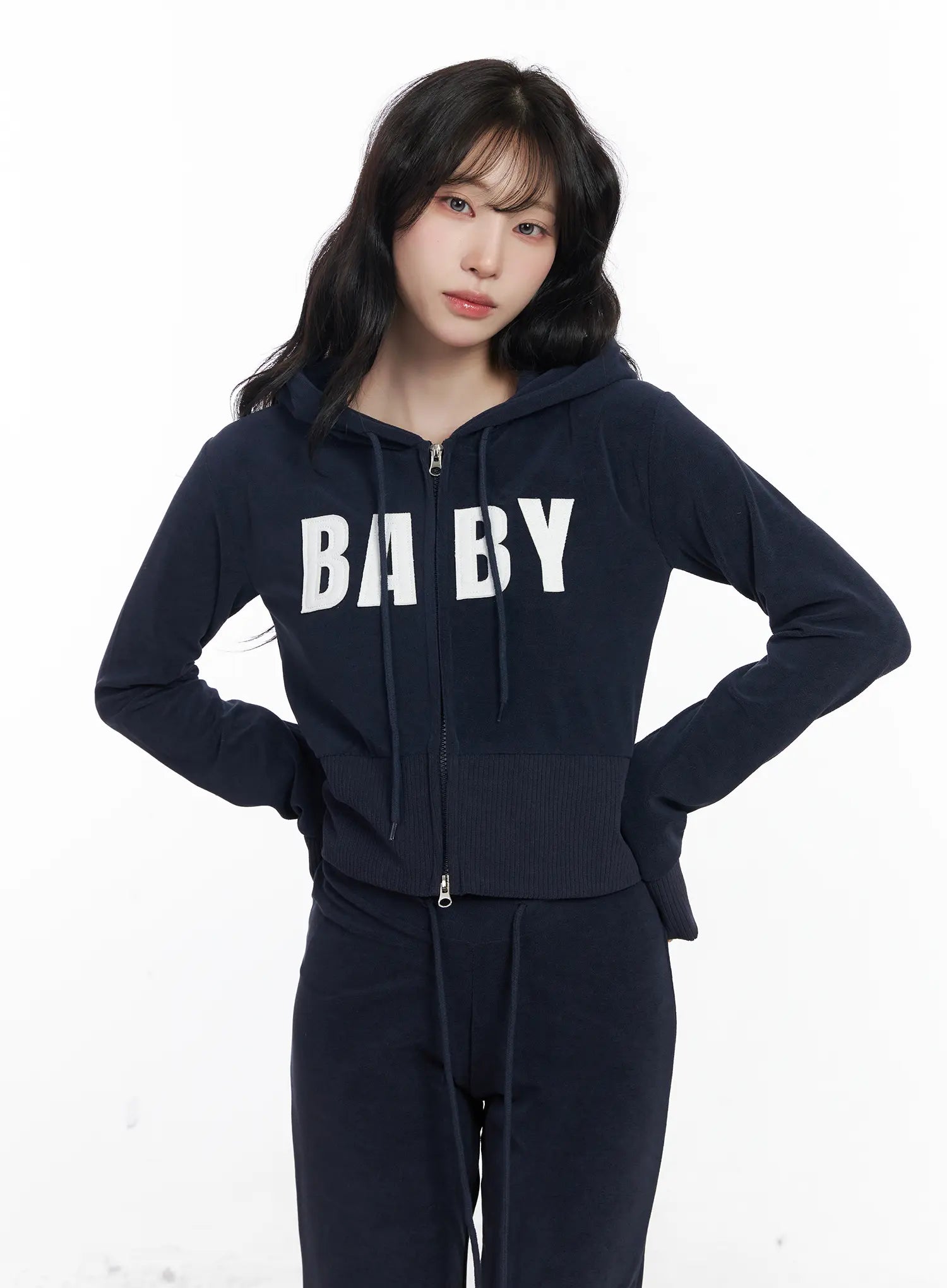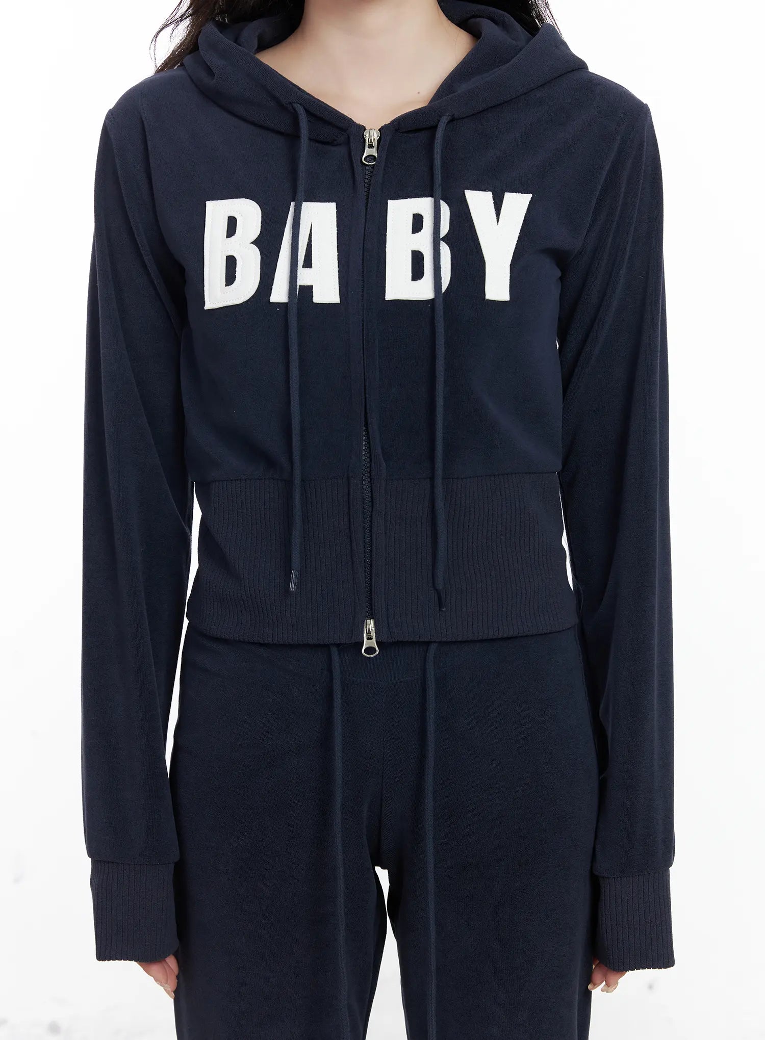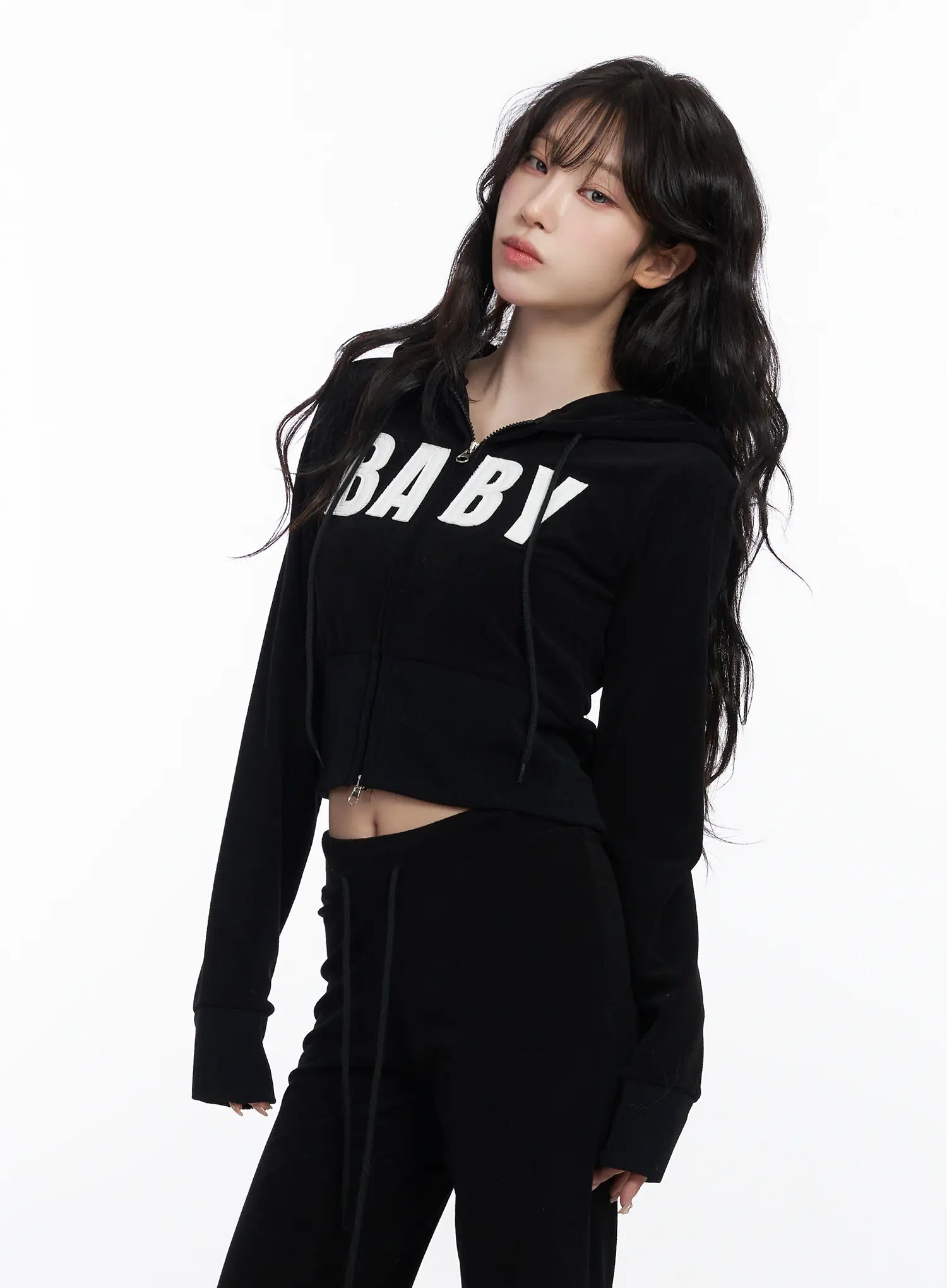 Velour Cropped Long Sleeve Graphic Hoodie CJ526
