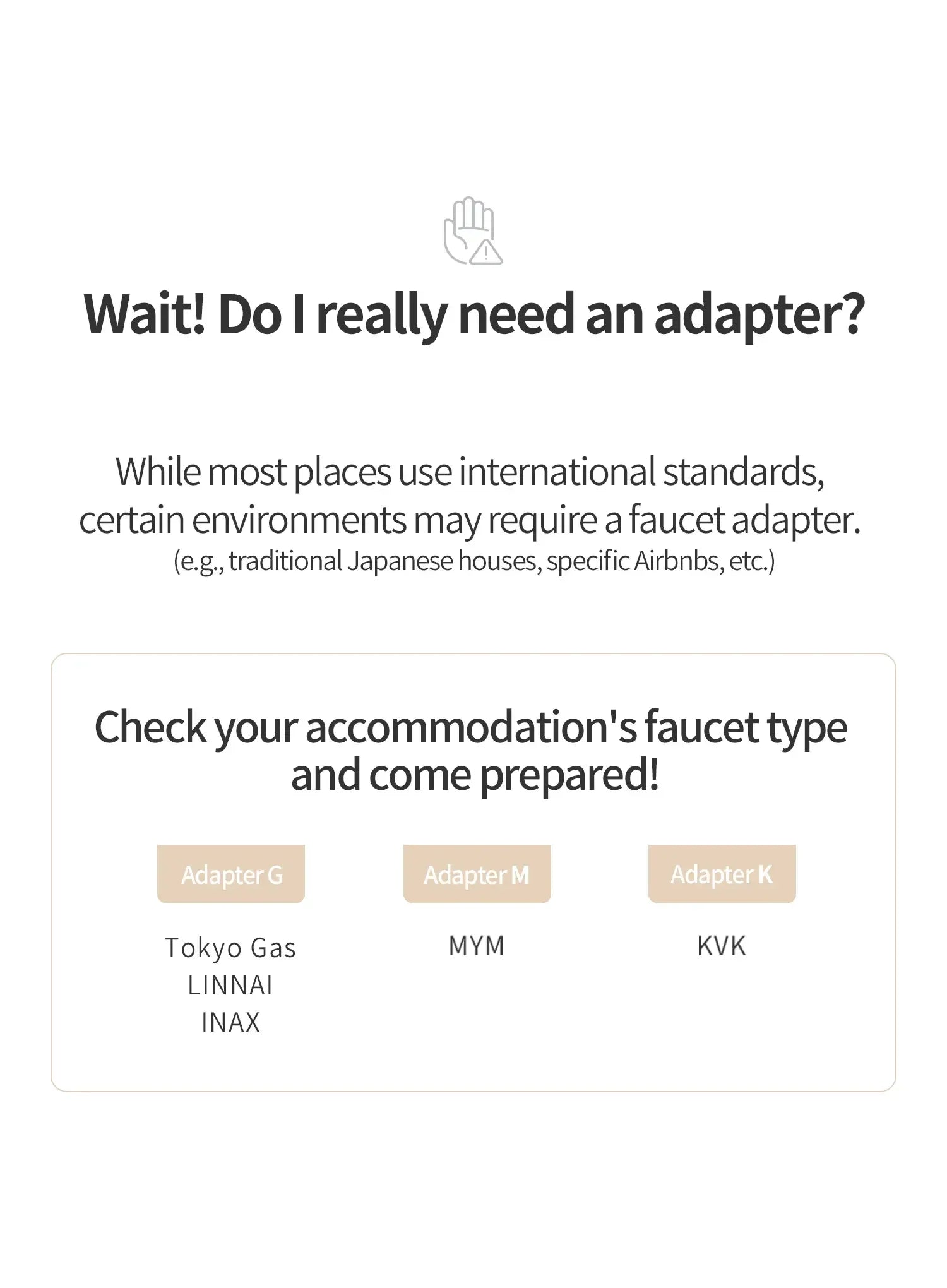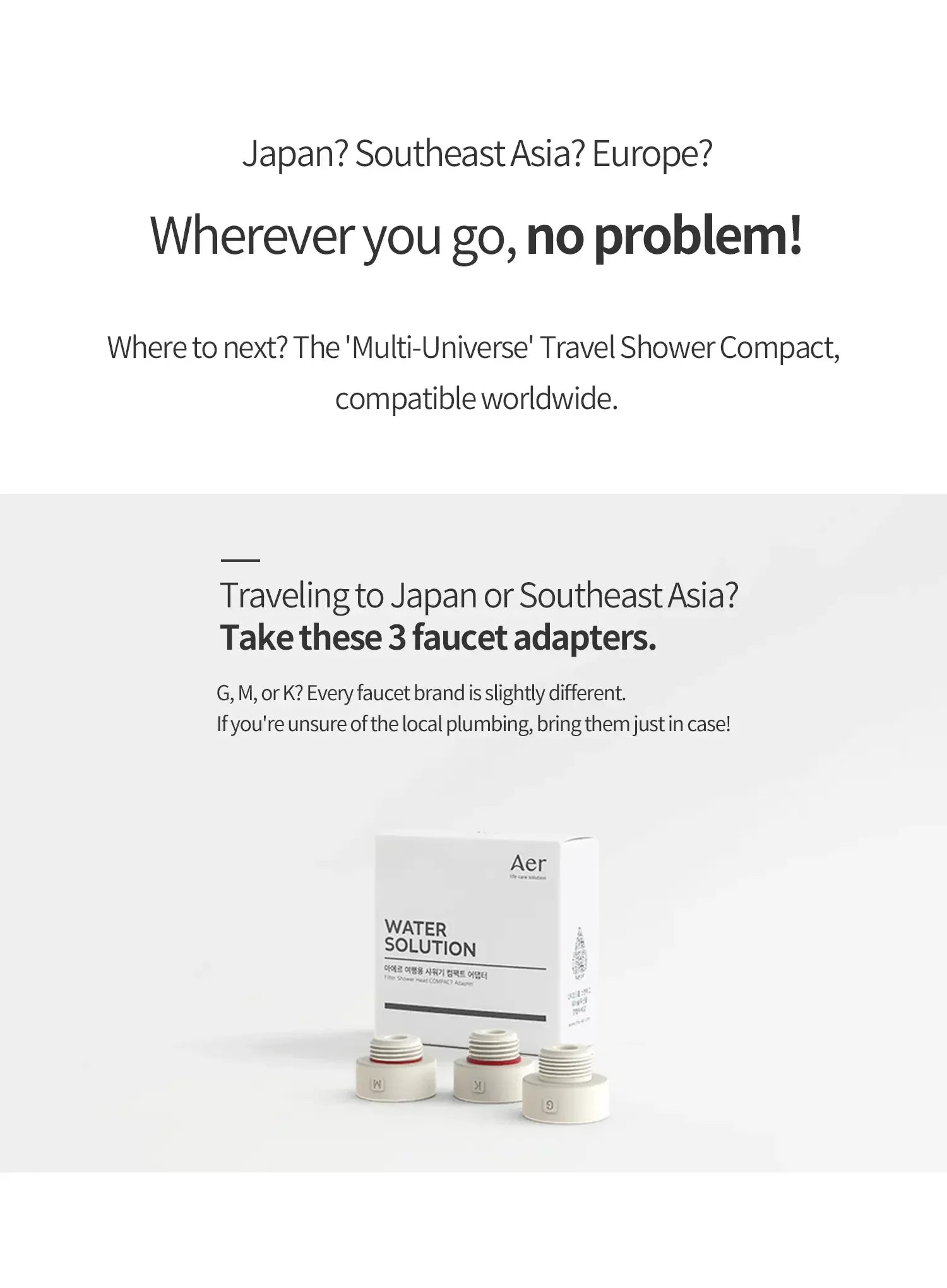 - Includes 3 faucet adapters, ideal for travel to Japan and Southeast Asia.