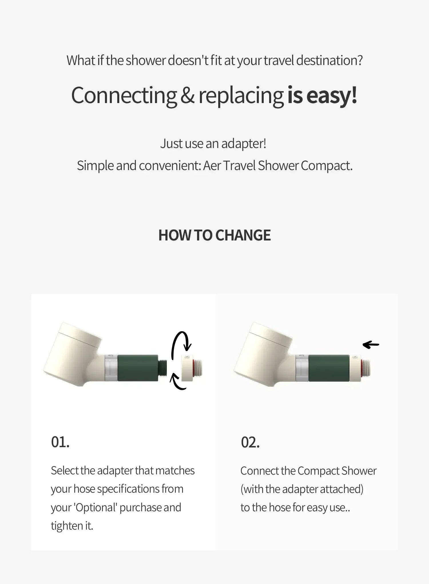 - Easy, hassle-free setup with the AER travel shower compact and adapters.